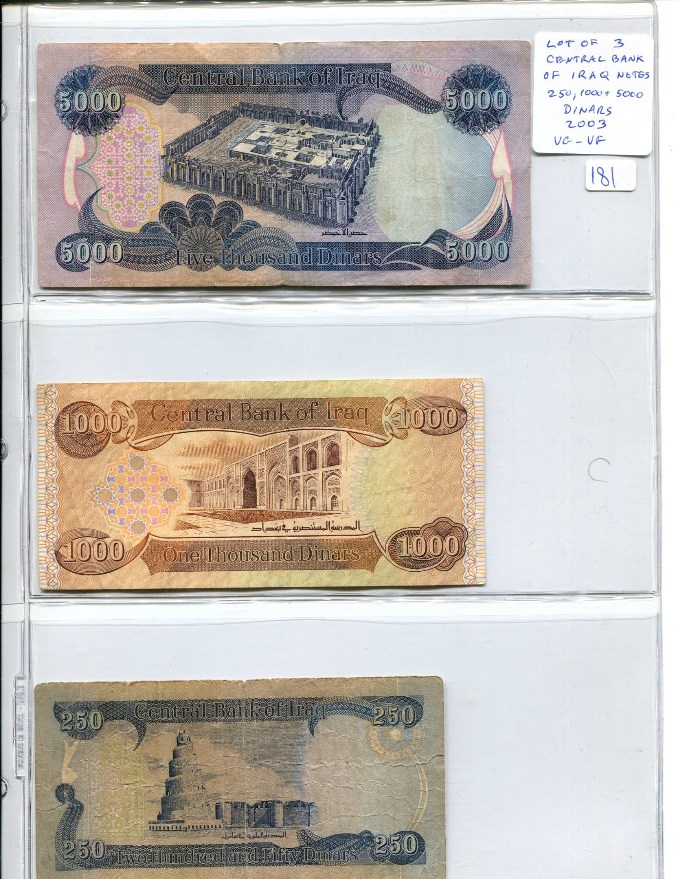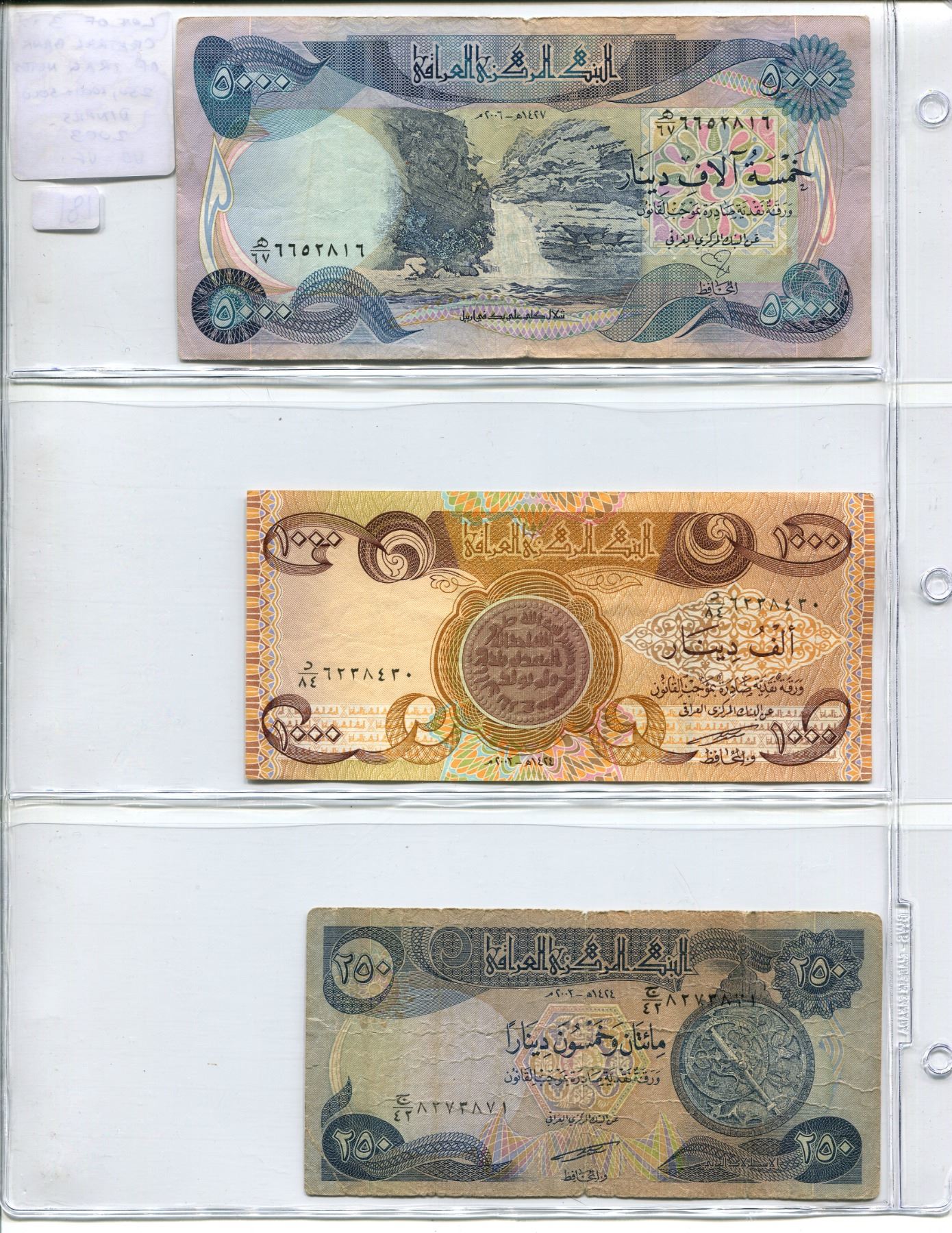 Lot of 3 Central Bank of Iraq notes. 250 dinars, 1000 dinars and 5000 dinars. VG to VF.