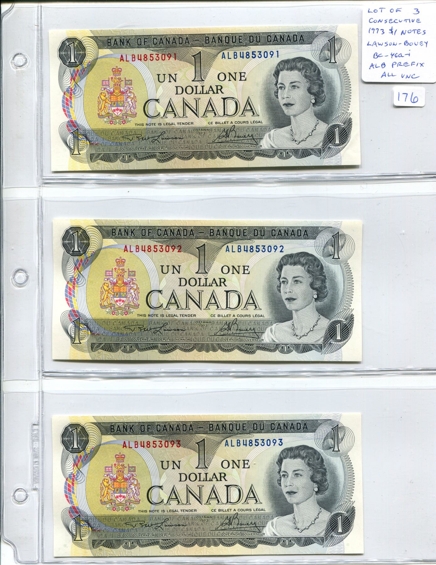 Lot of 3 Consecutive Serial Number 1973 $1 notes. Lawson-Bouey signatures. ALB Prefix. Serial Numbers 4853091,92, & 93. BC-46a-i. All Unc.