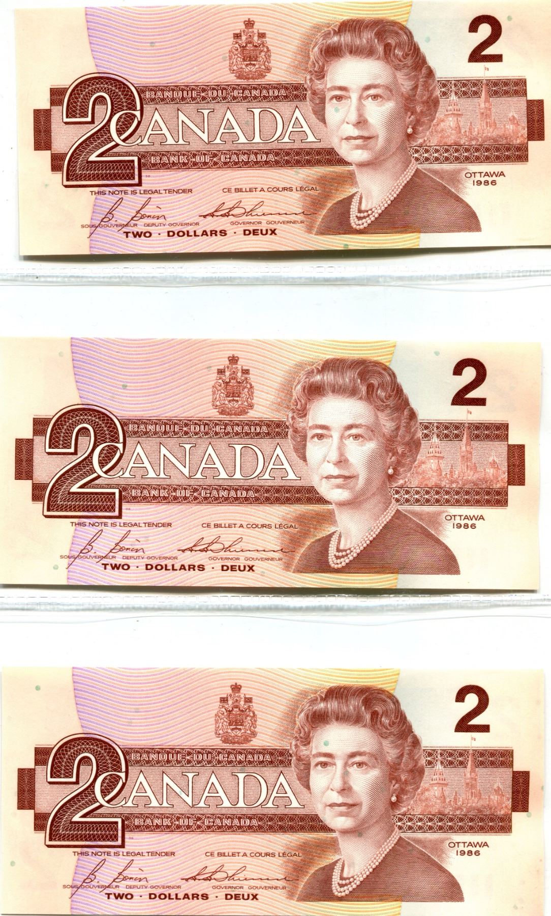 Lot of 3 Consecutive Serial Number 1986 $2 notes. Bonin-Thiessen signatures. EGT Prefix. BC-55c-i. Unc.