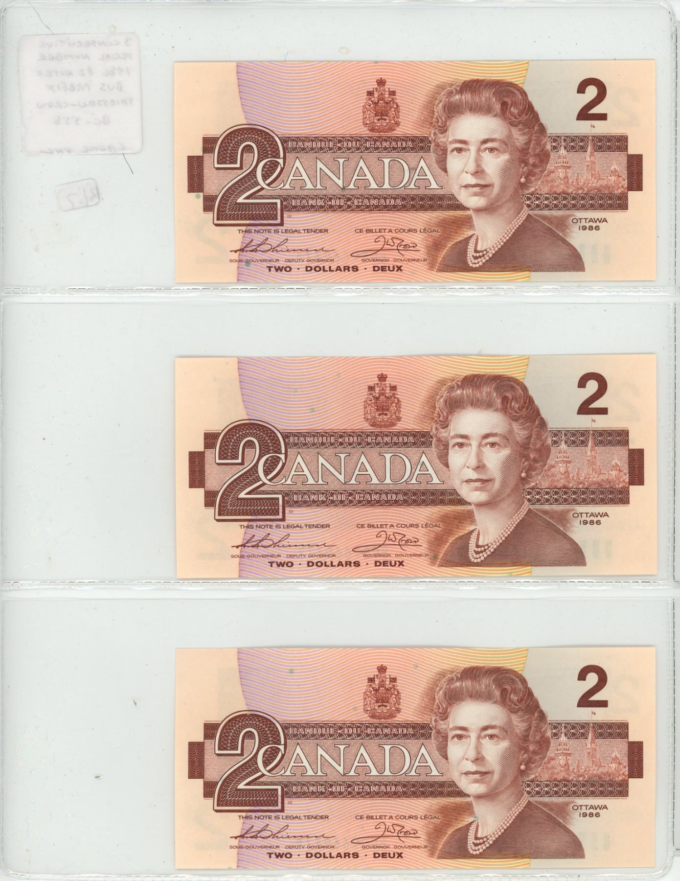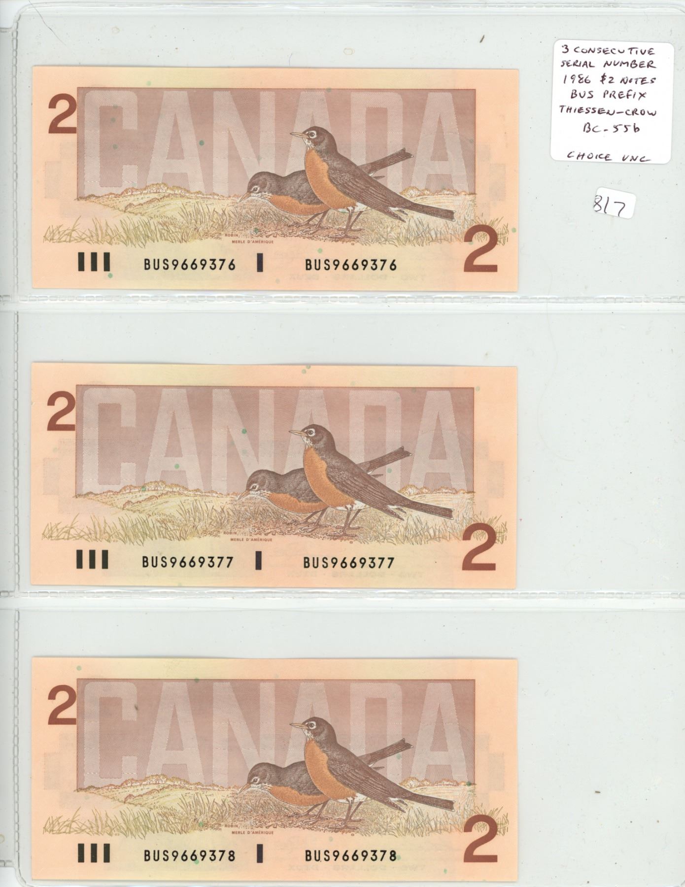 Lot of 3 Consecutive Serial Number 1986 $2 notes. Thiessen-Crow signatures. BUS Prefix. BC-55b. Choice Unc.