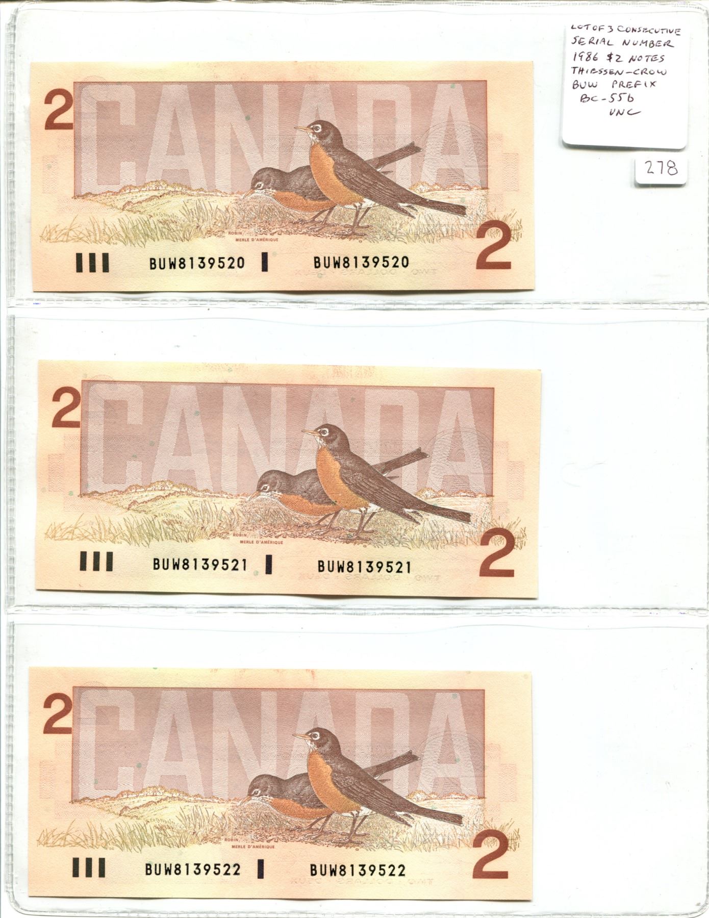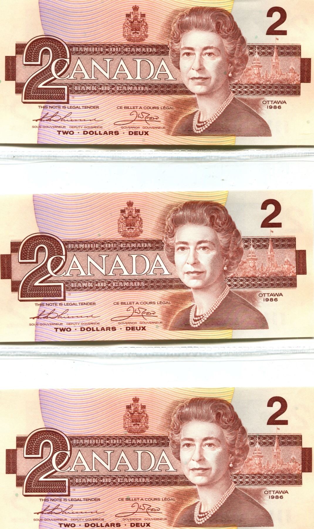 Lot of 3 Consecutive Serial Number 1986 $2 notes. Thiessen-Crow signatures. BUW Prefix. BC-55b. Unc.