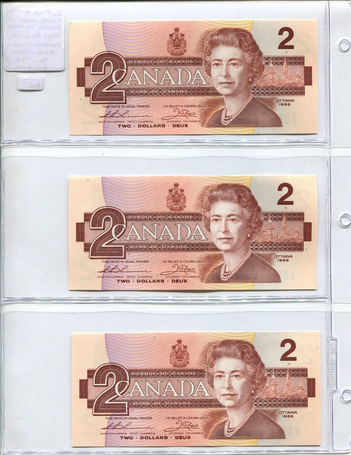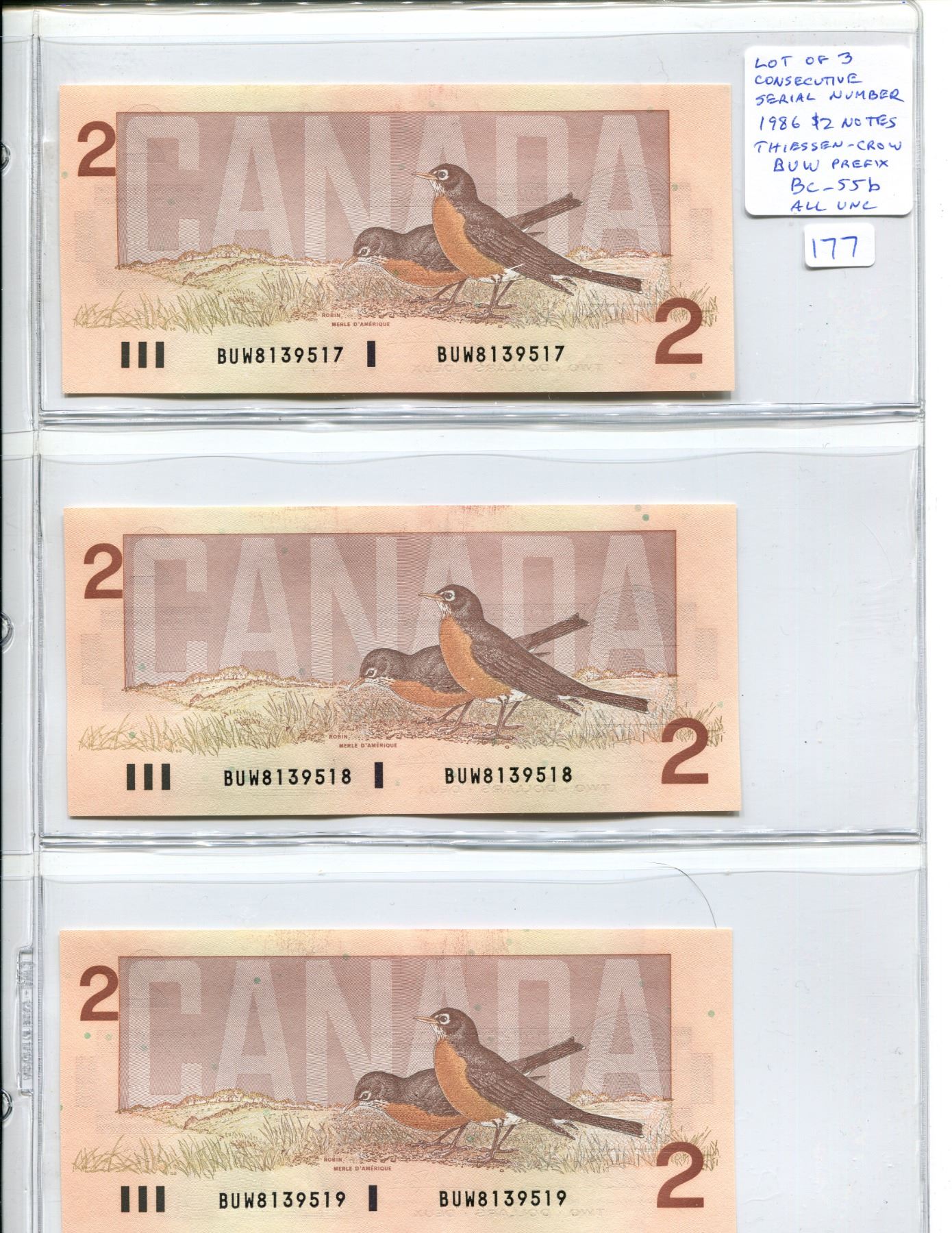 Lot of 3 Consecutive Serial Number 1986 $2 notes. Thiessen-Crow signatures. BUW Prefix. Serial Numbers 8139517, 18, & 19. BC-55a. All Unc.
