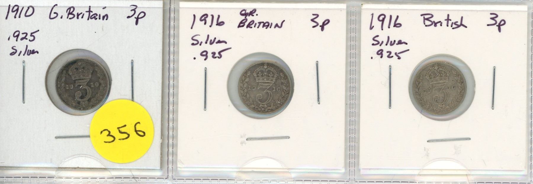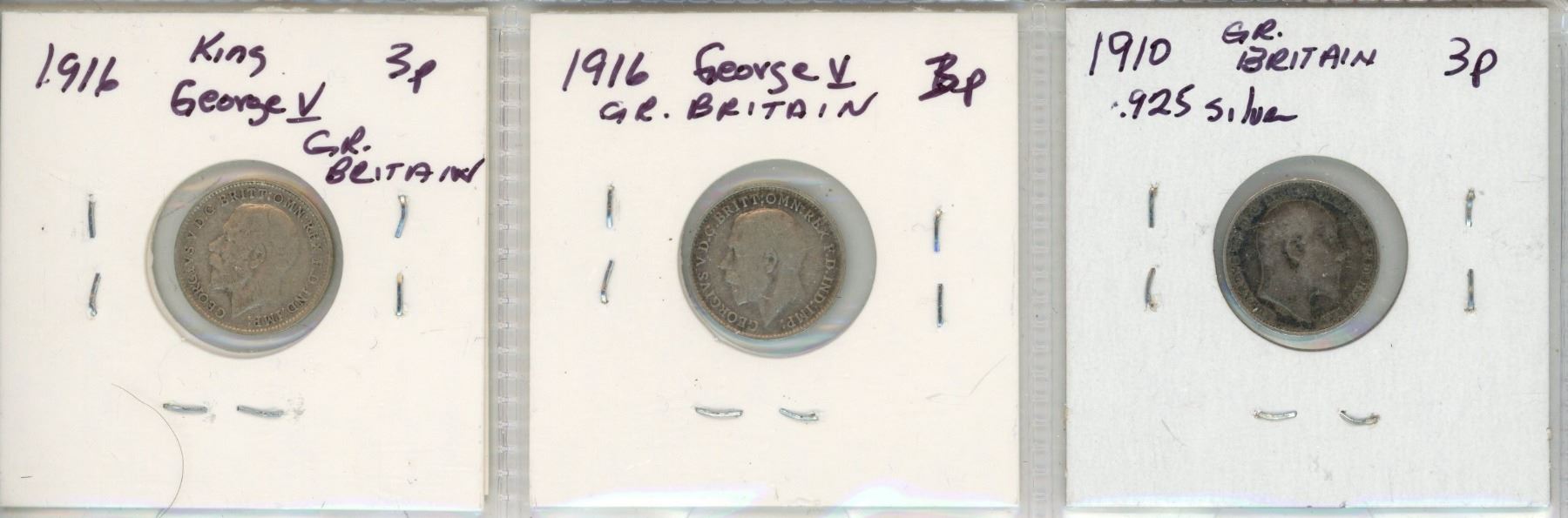 Lot of 3 Great Britain Silver 3 Pence: 1910 & 1916 (x2)