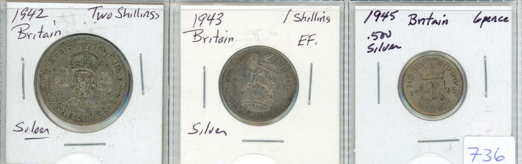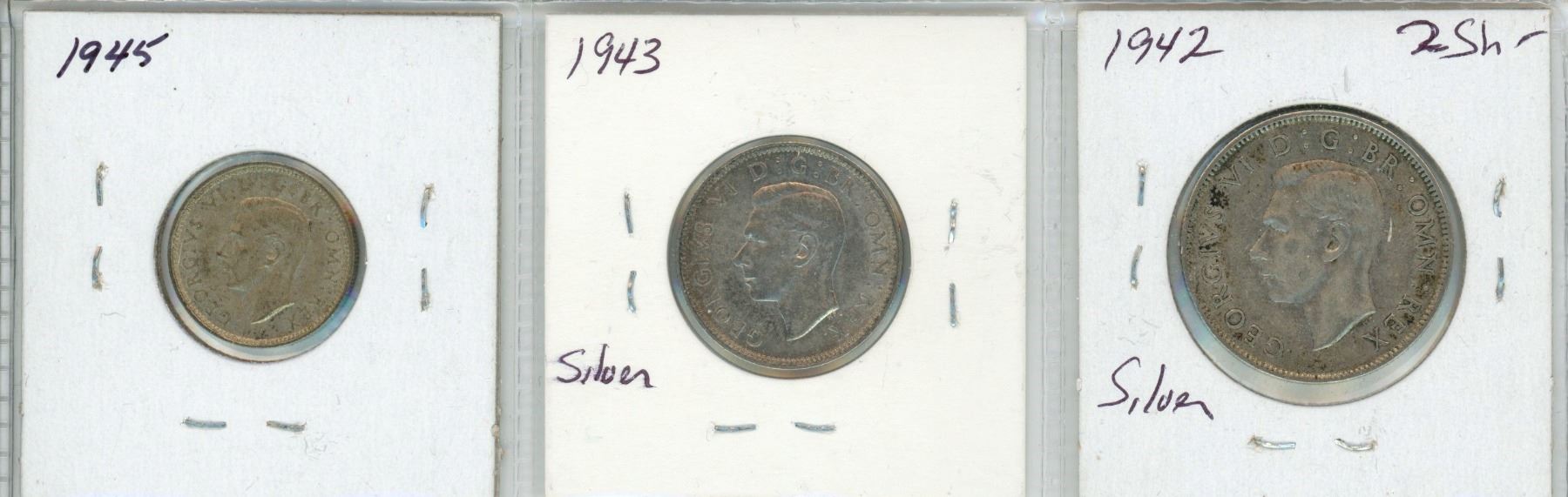 Lot of 3 Great Britain Silver coins: 1942 Two Shillings, 1943 Shilling, 1945 Six Pence