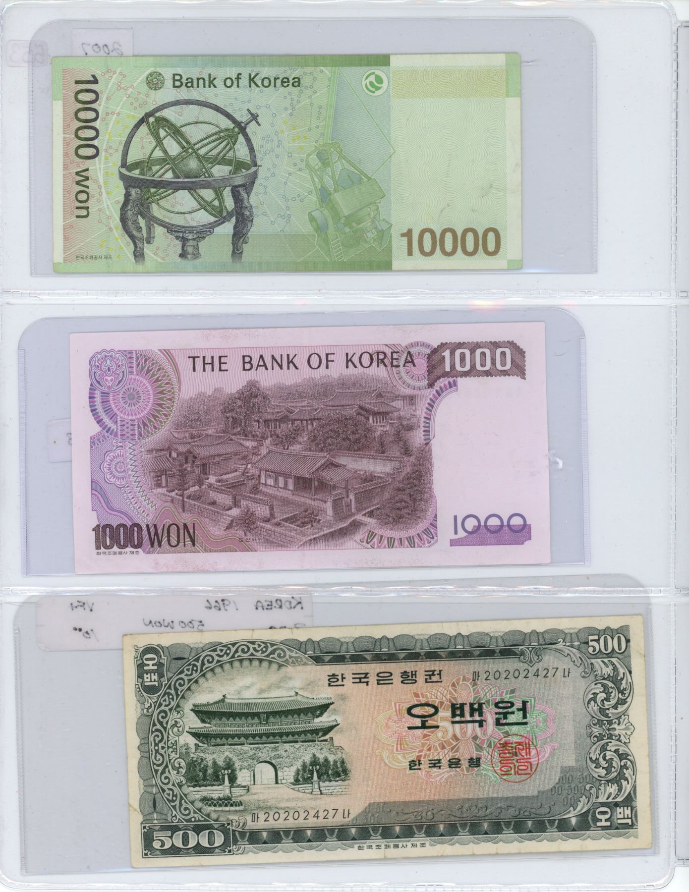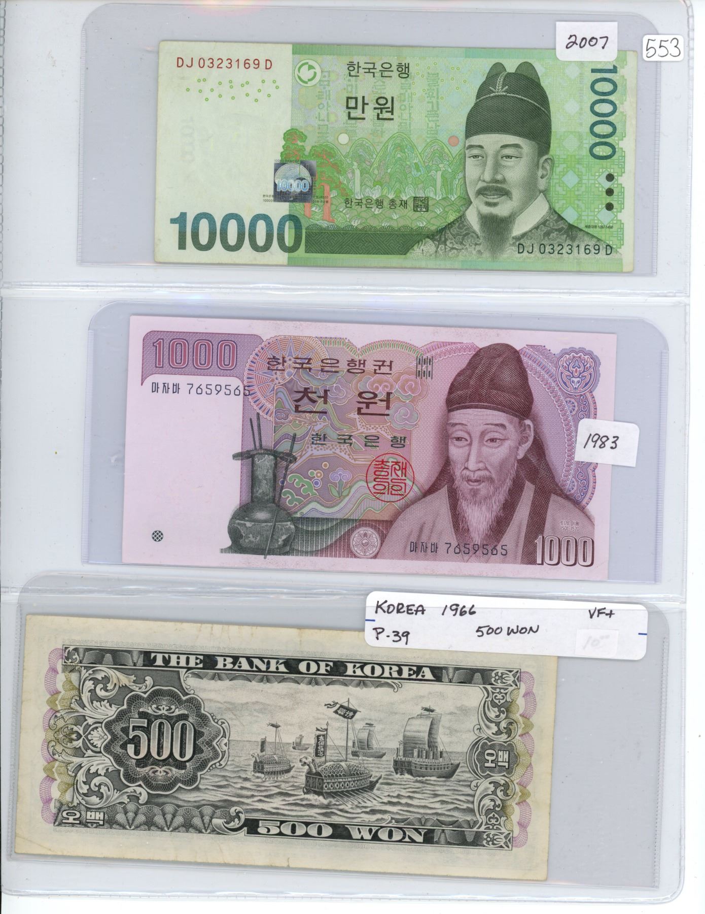 Lot of 3 Korean notes: 10000 Won 2007; 1000 Won 1983; 500 Won 1966