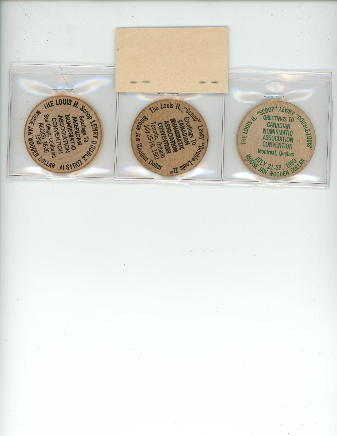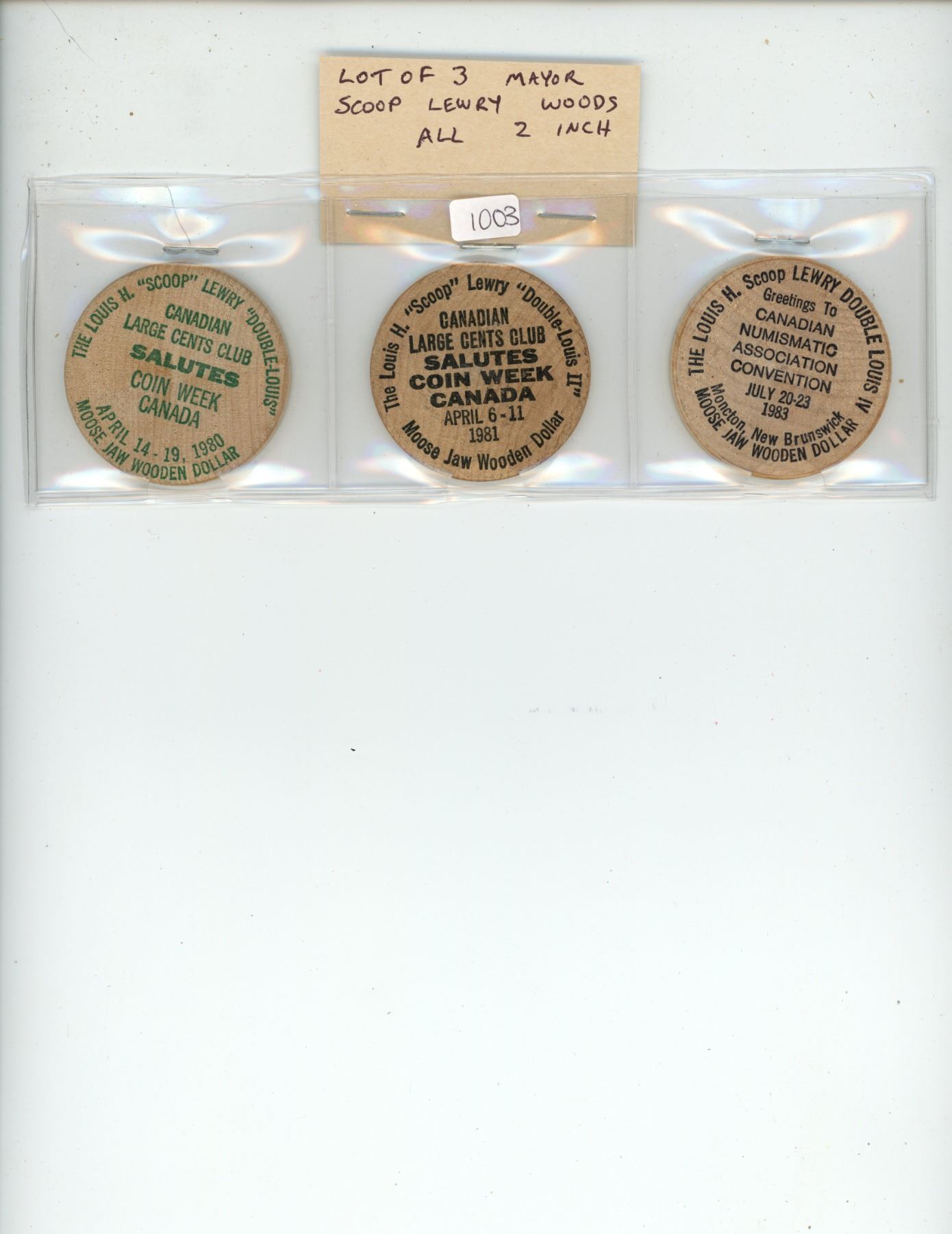 Lot of 3 Moose Jaw Mayor Louis “Scoop” Lewry 2-inch Woods. Green 1980, Black 1981 & Black 1983.