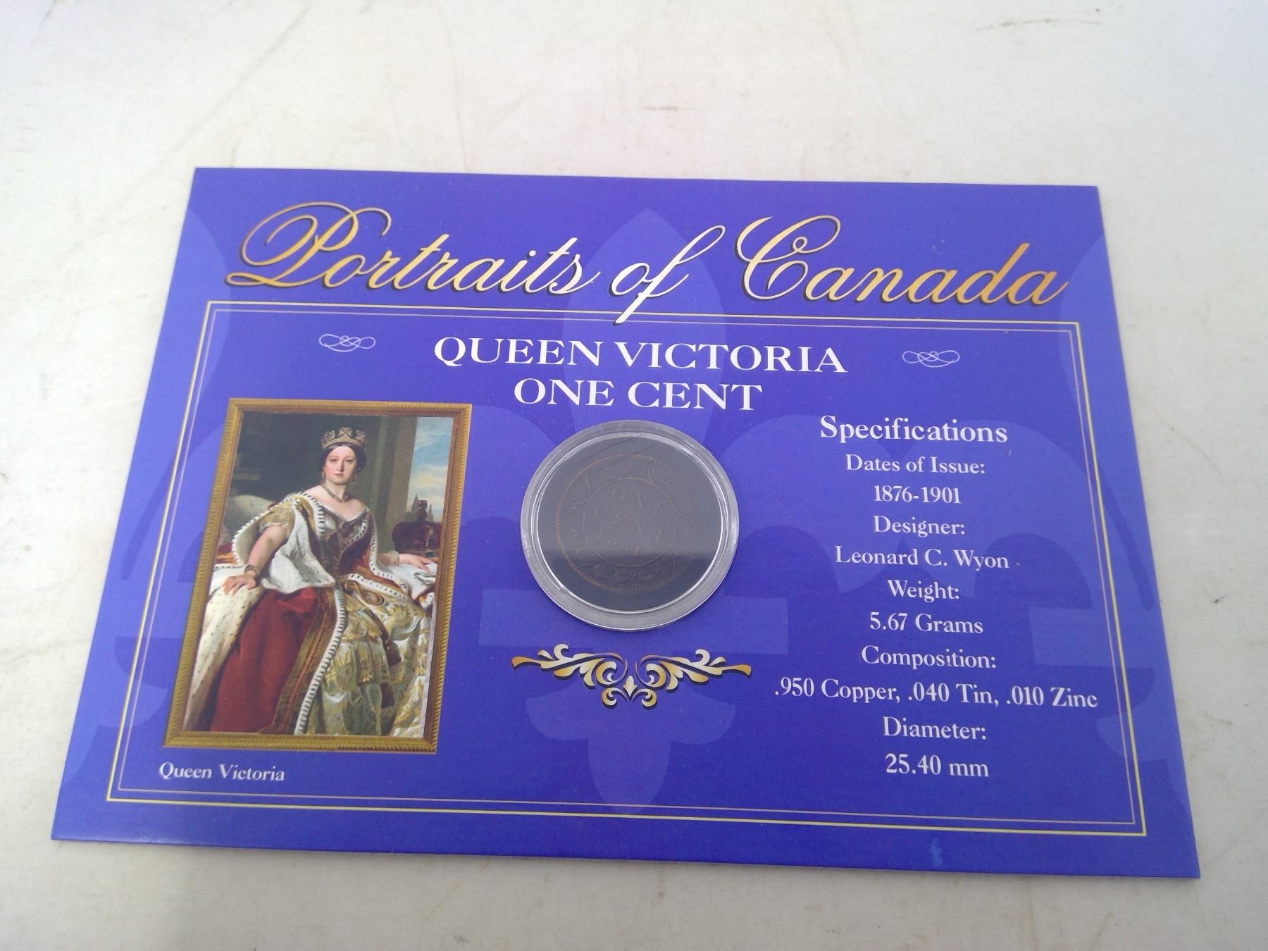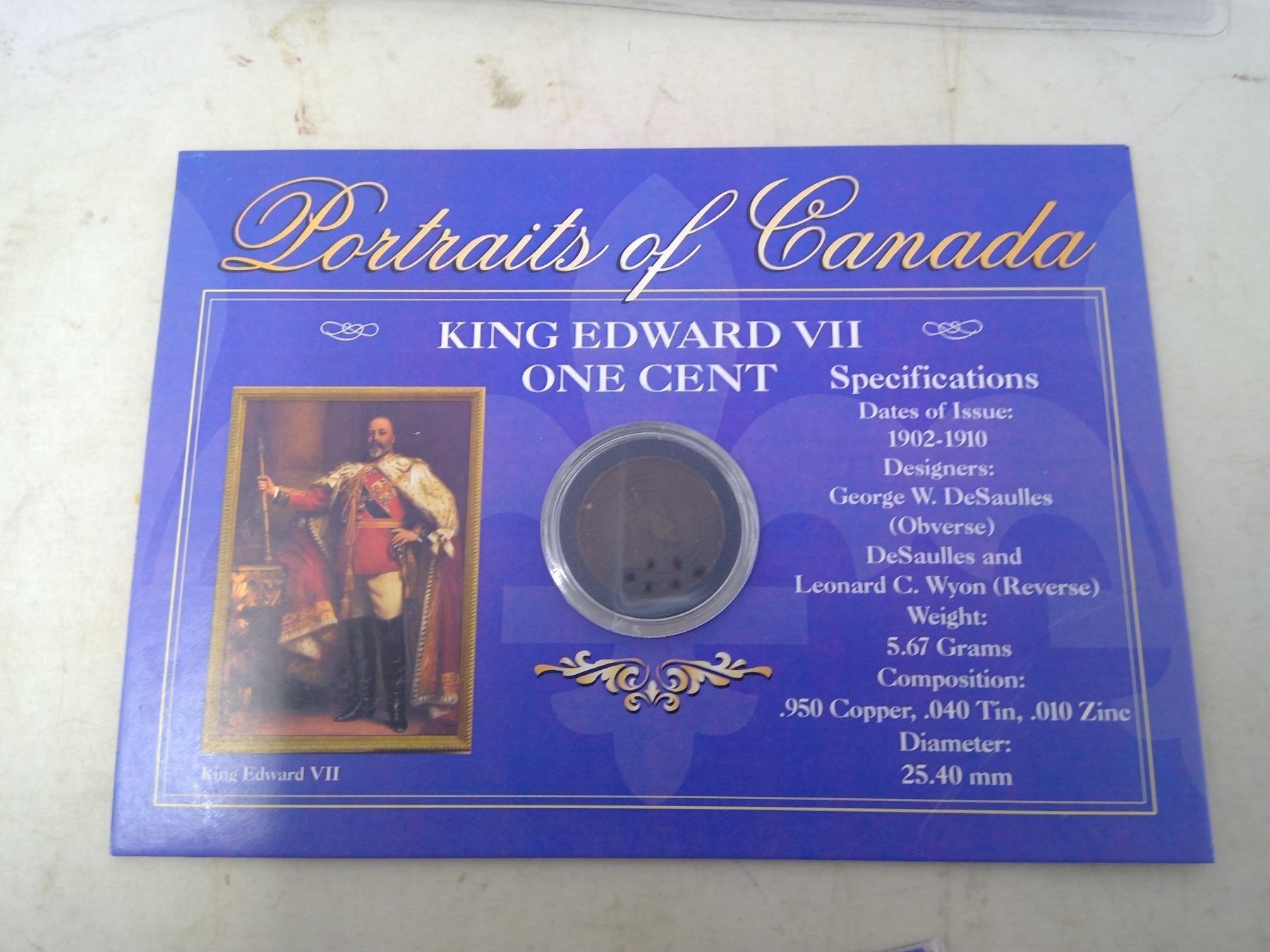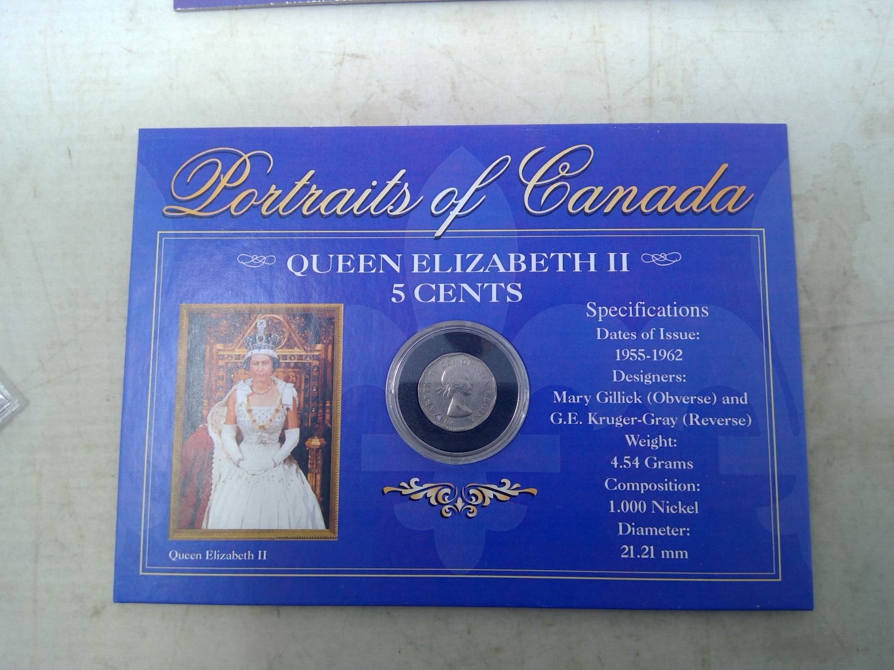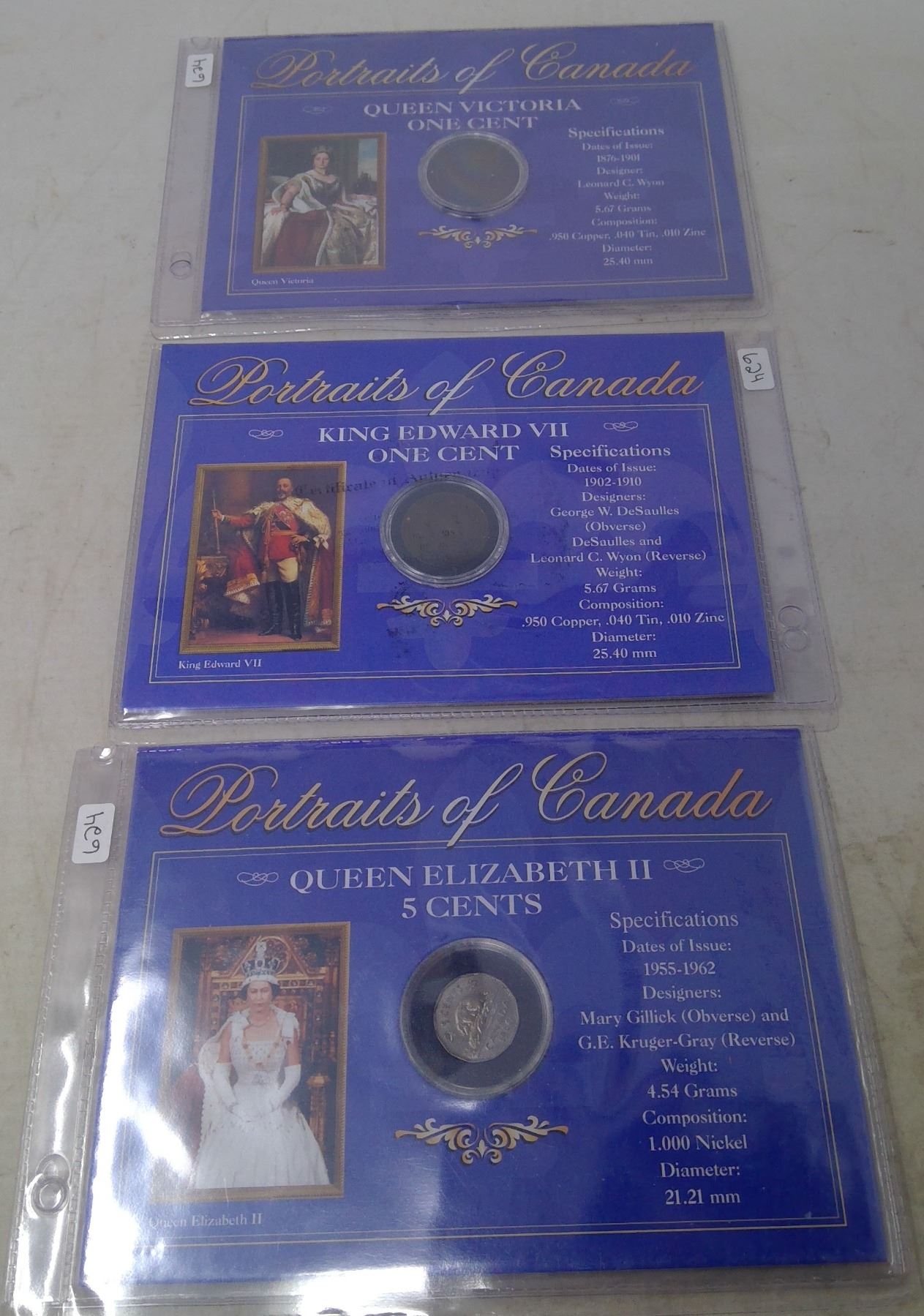 Lot of 3 Portraits of Canada coins. Includes Queen Victoria large cent, King Edward VII large cent and Queen Elizabeth II nickel 5 cents. Each housed in a folder and issued by the Morgan Mint.