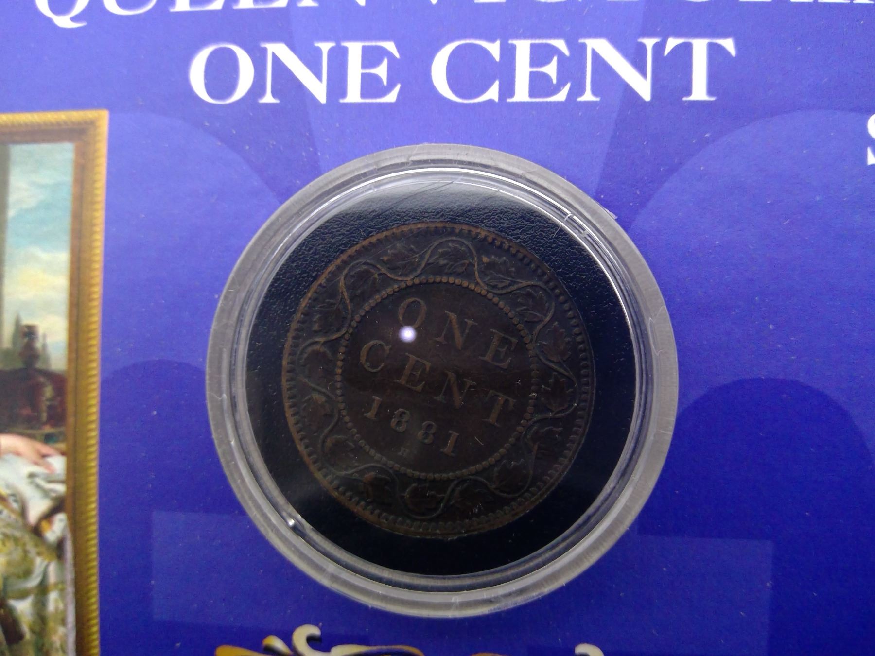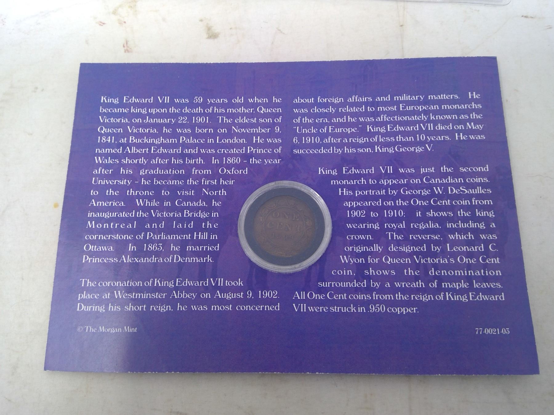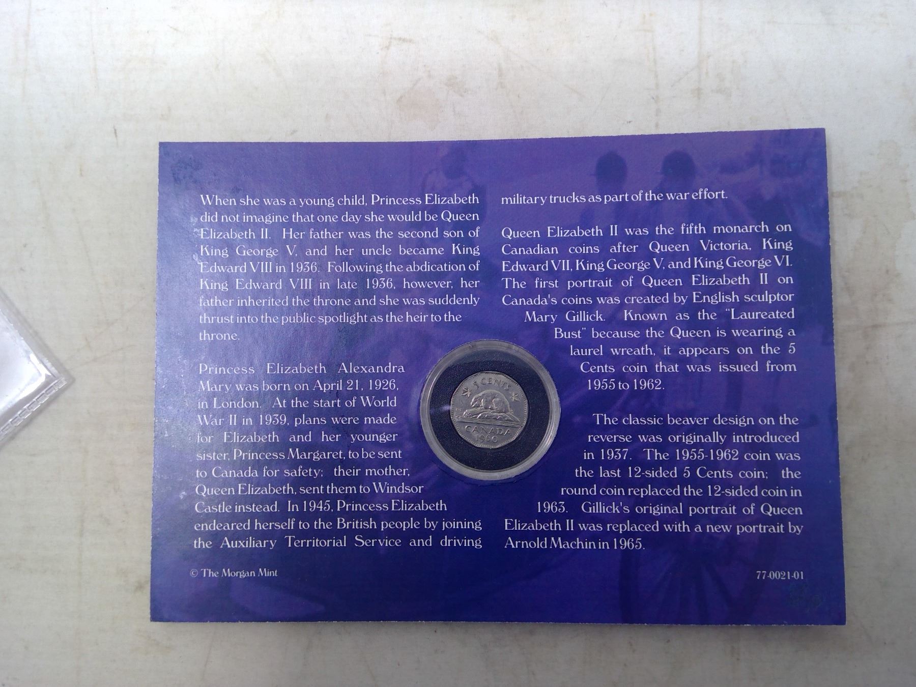Lot of 3 Portraits of Canada coins. Includes Queen Victoria large cent, King Edward VII large cent and Queen Elizabeth II nickel 5 cents. Each housed in a folder and issued by the Morgan Mint.