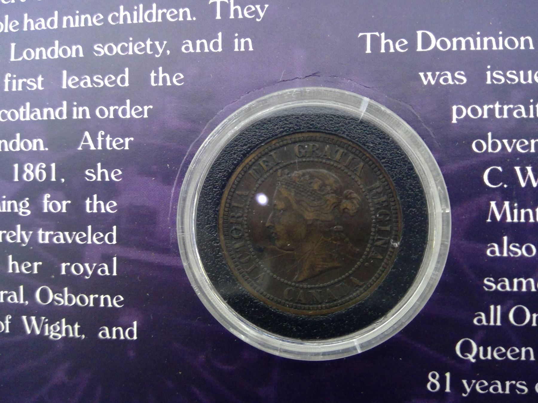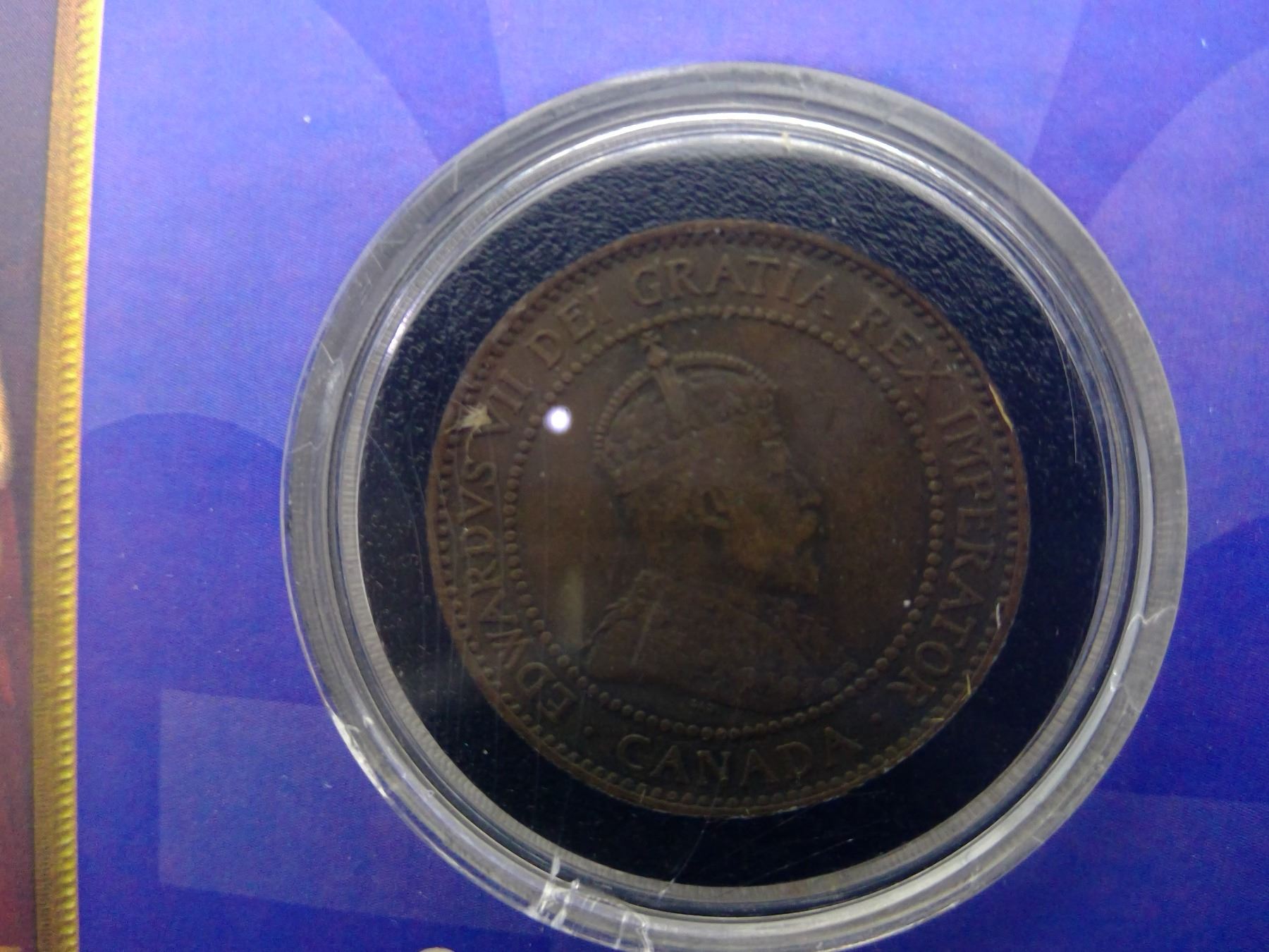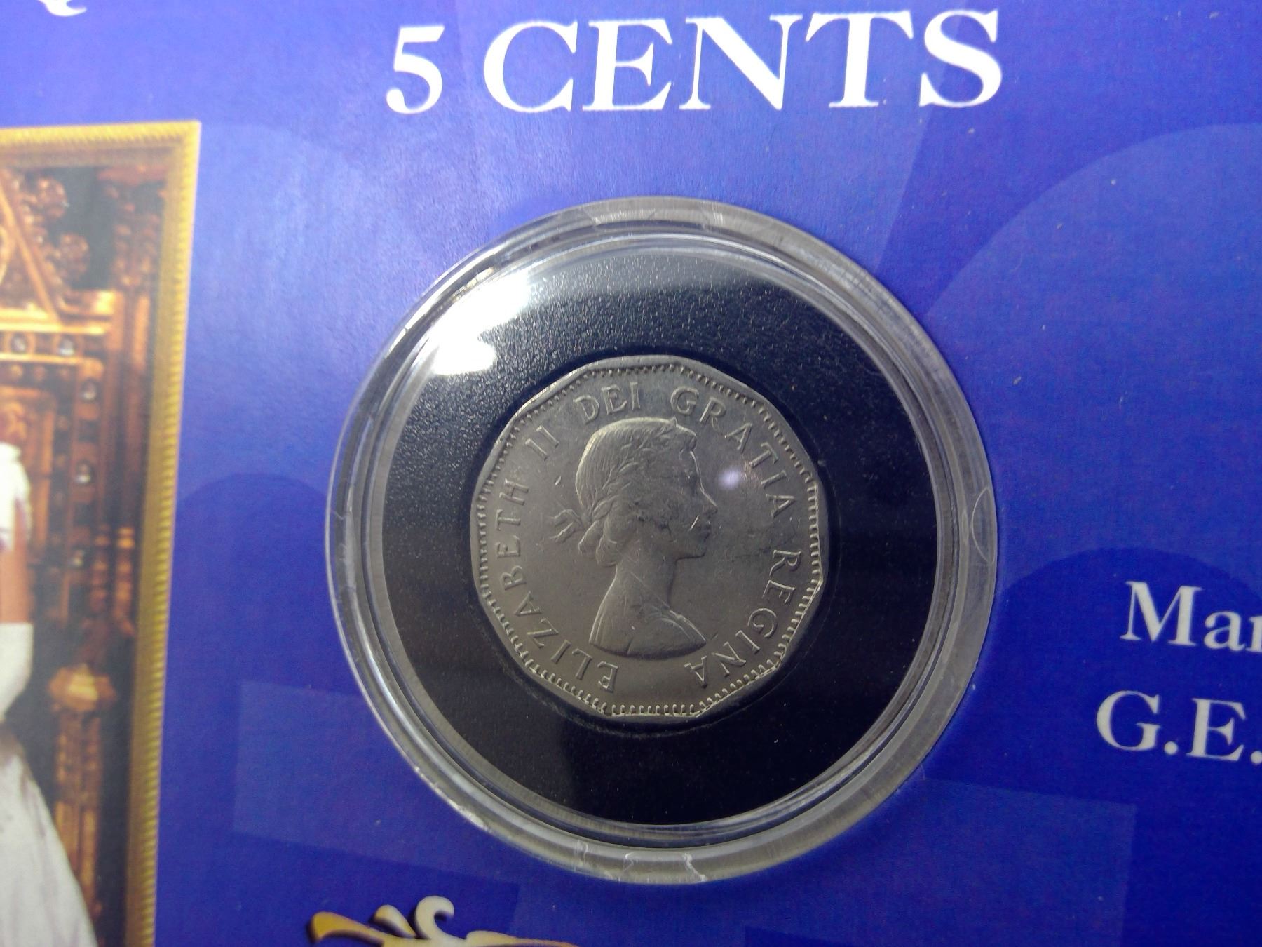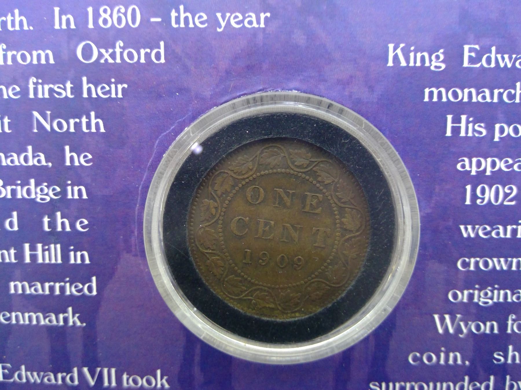 Lot of 3 Portraits of Canada coins. Includes Queen Victoria large cent, King Edward VII large cent and Queen Elizabeth II nickel 5 cents. Each housed in a folder and issued by the Morgan Mint.