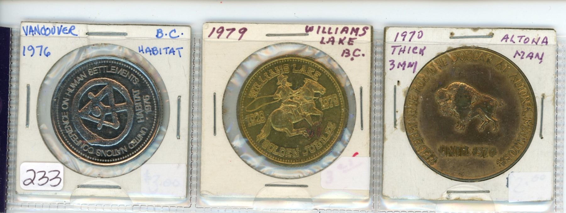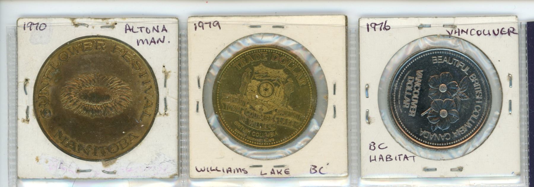 Lot of 3 Trade Dollars: 1976 Vancouver BC Habitat, 1979 Williams Lake, 1970 Altona, Manitoba One Dollar Sunflower Festival