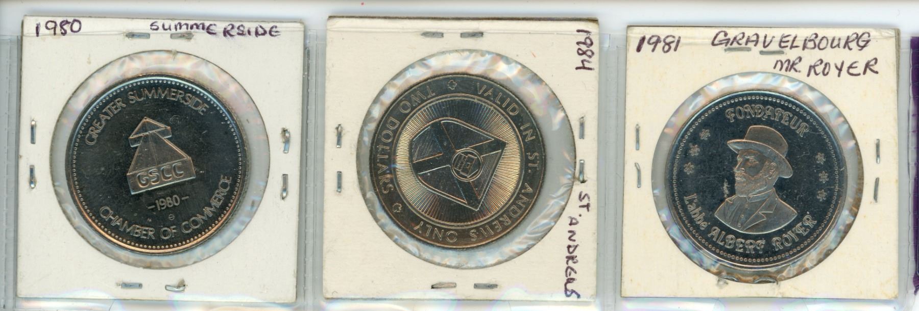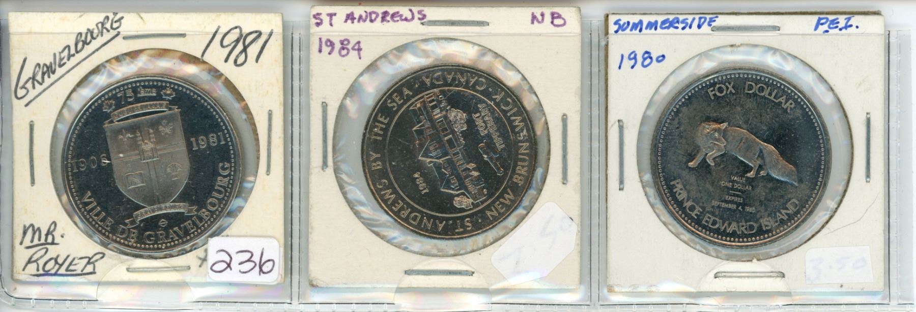 Lot of 3 Trade Dollars: 1981 Gravelbourg Sask. Mr. Royer, 1984 St. Andrews New Brunswick, 1980 Summerside PEI Fox Dollar
