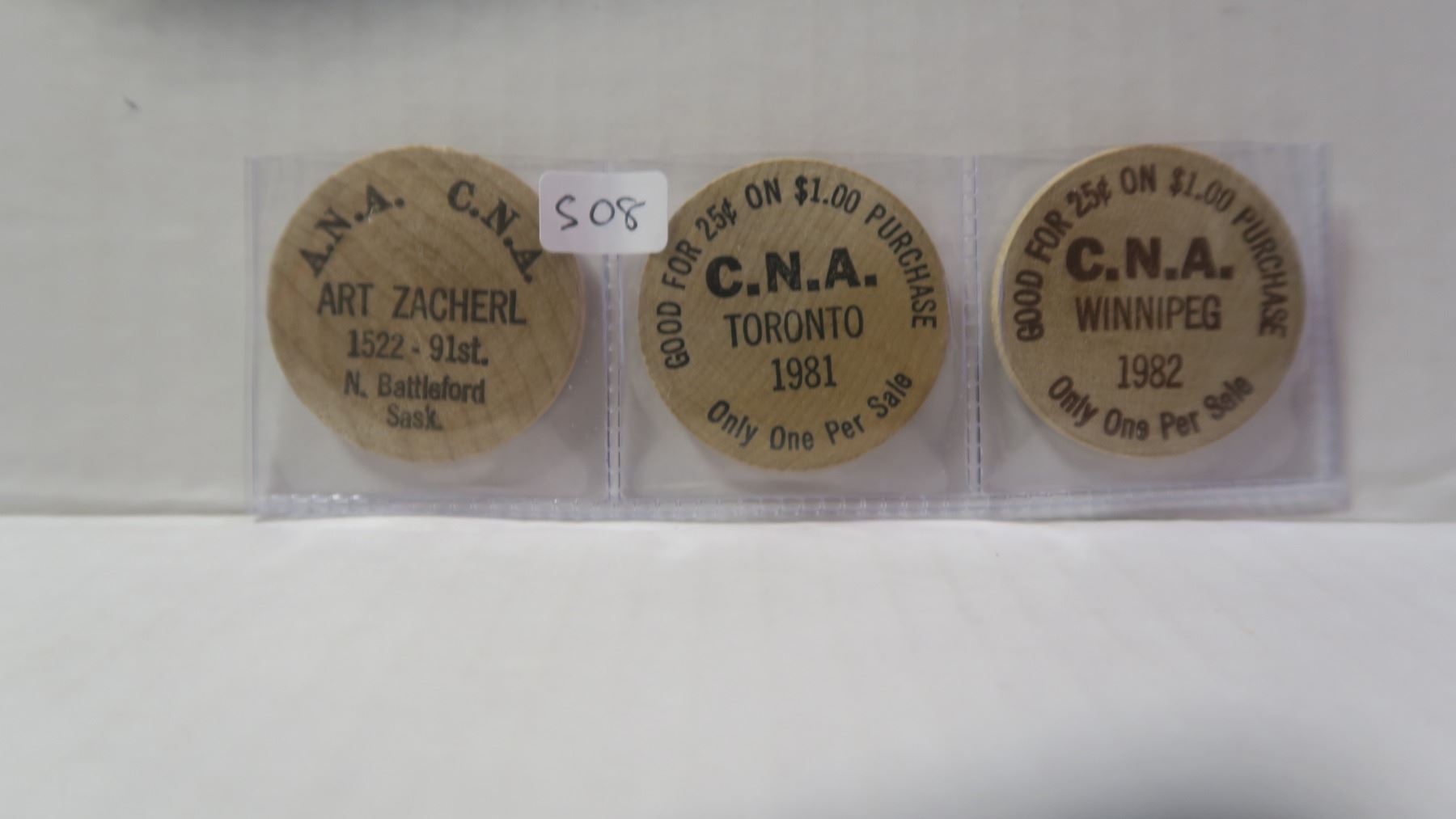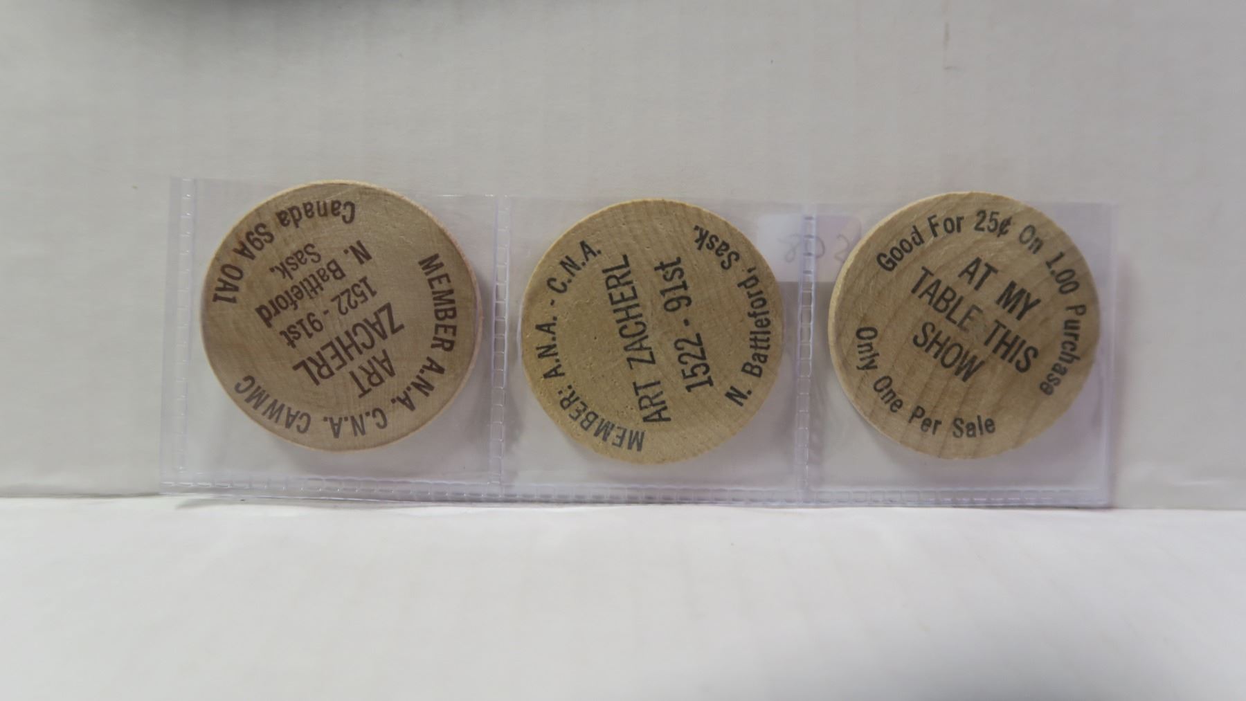 Lot of 3 Woods. All issued by Art Zacherl, well-known North Battleford coin collector.