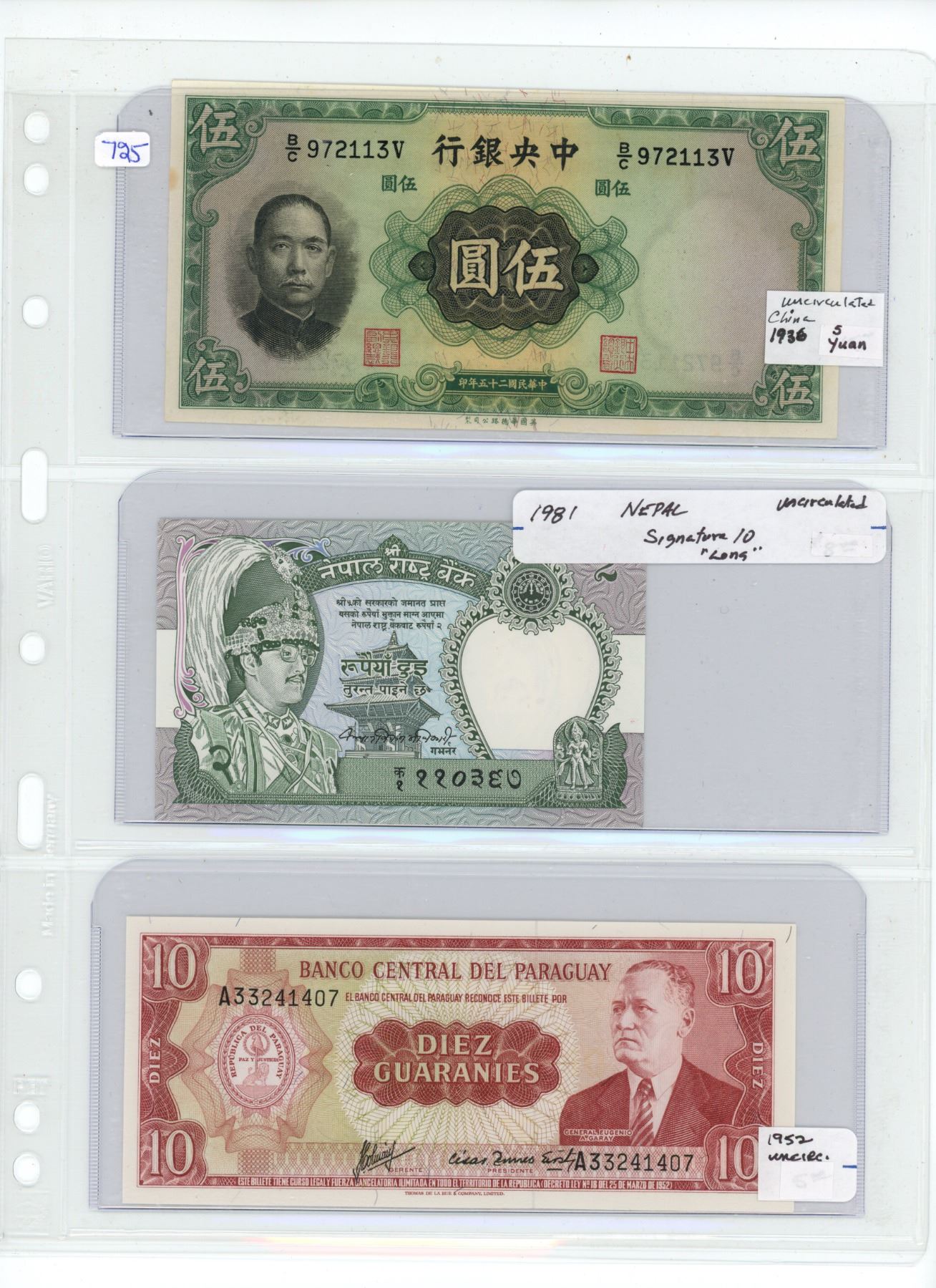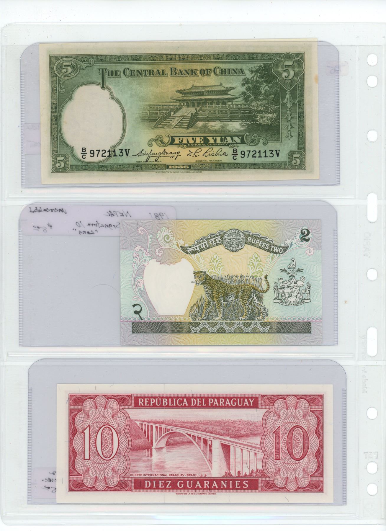 Lot of 3 banknotes: 1936 China 5 Yuan, 1981 Nepal 2 Rupees, 1952 Paraguay 10 Guaranies