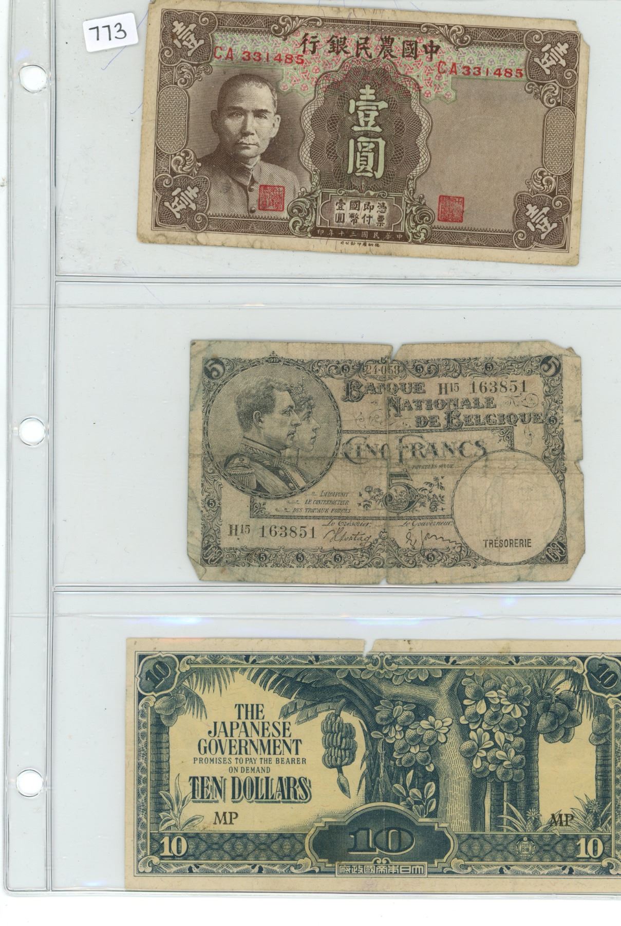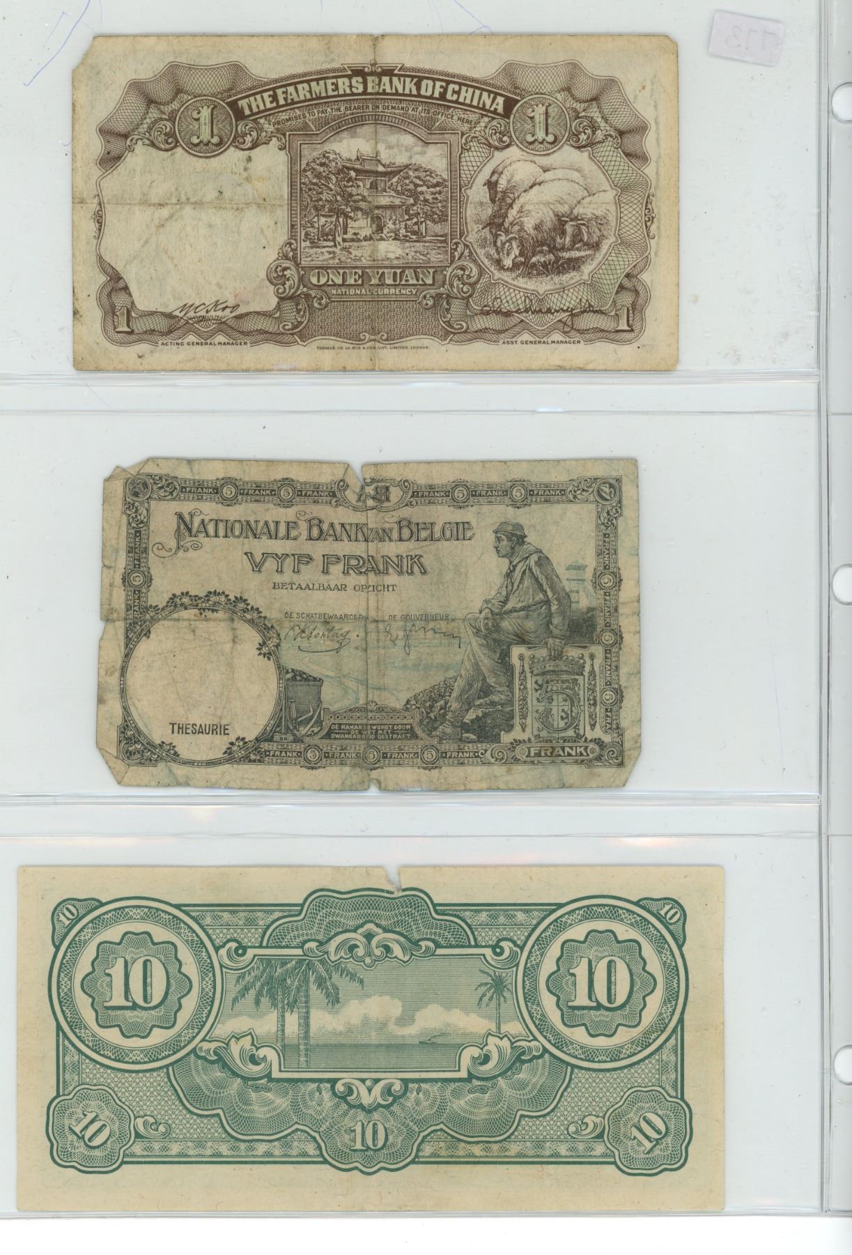 Lot of 3 bills: 1941 Farmers bank of china 1 yuan; 1938 belgium 5 frank; 1942-1944 "Banana money" Malaysia under japan occupation