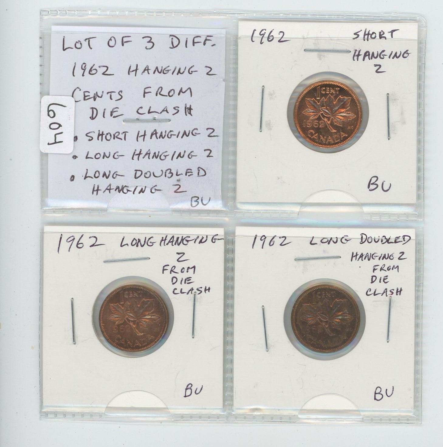 Lot of 3 different 1962 Hanging 2 small cents. All are the result of Clashed Dies and include Short Hanging 2, Long Hanging 2 and Long Doubled Hanging 2. Two coins are BU Red.