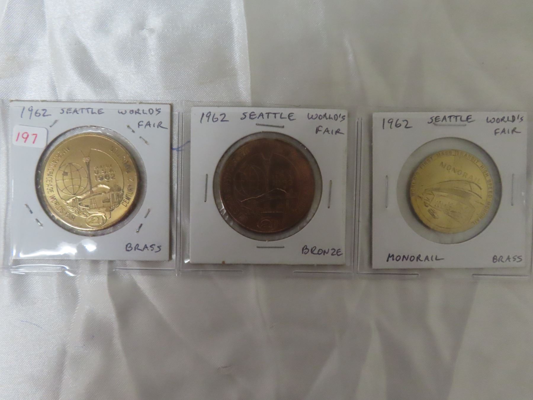 Lot of 3 different 1962 Seattle, Washington World’s Fair Trade Dollars. BU.