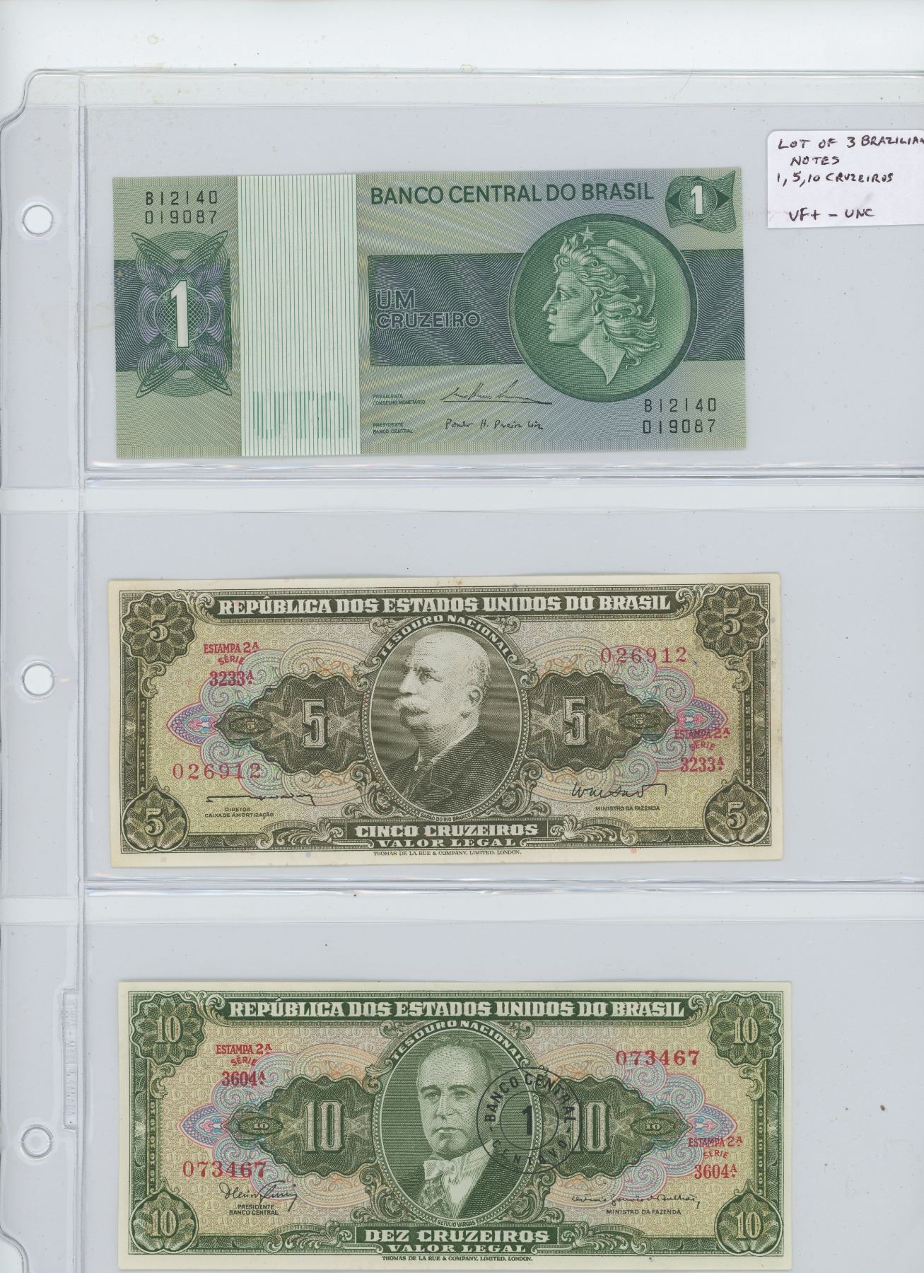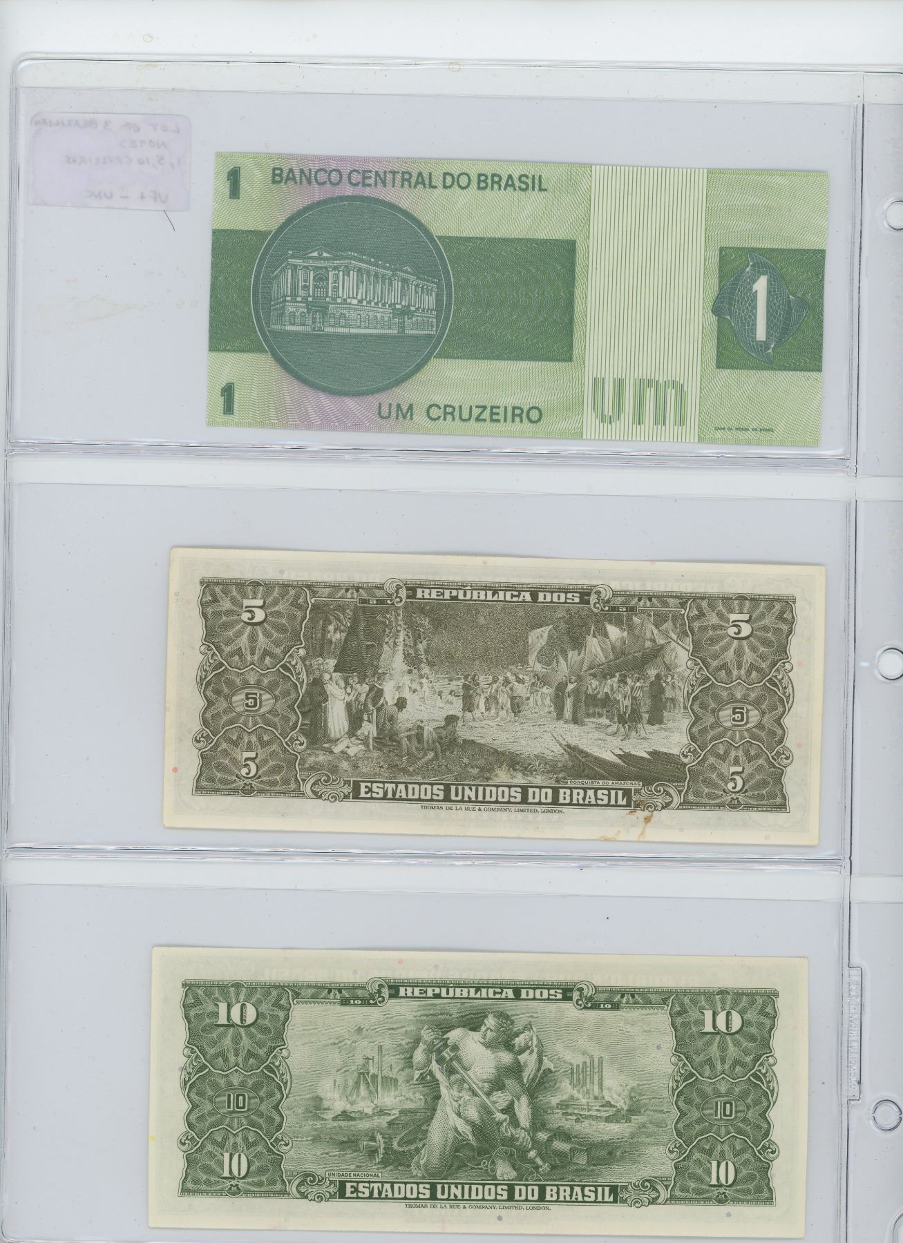 Lot of 3 different Brazilian notes: 1 Cruzeiro, 5 Cruzeiros, 10 Cruzeiros. VF+ - Unc.