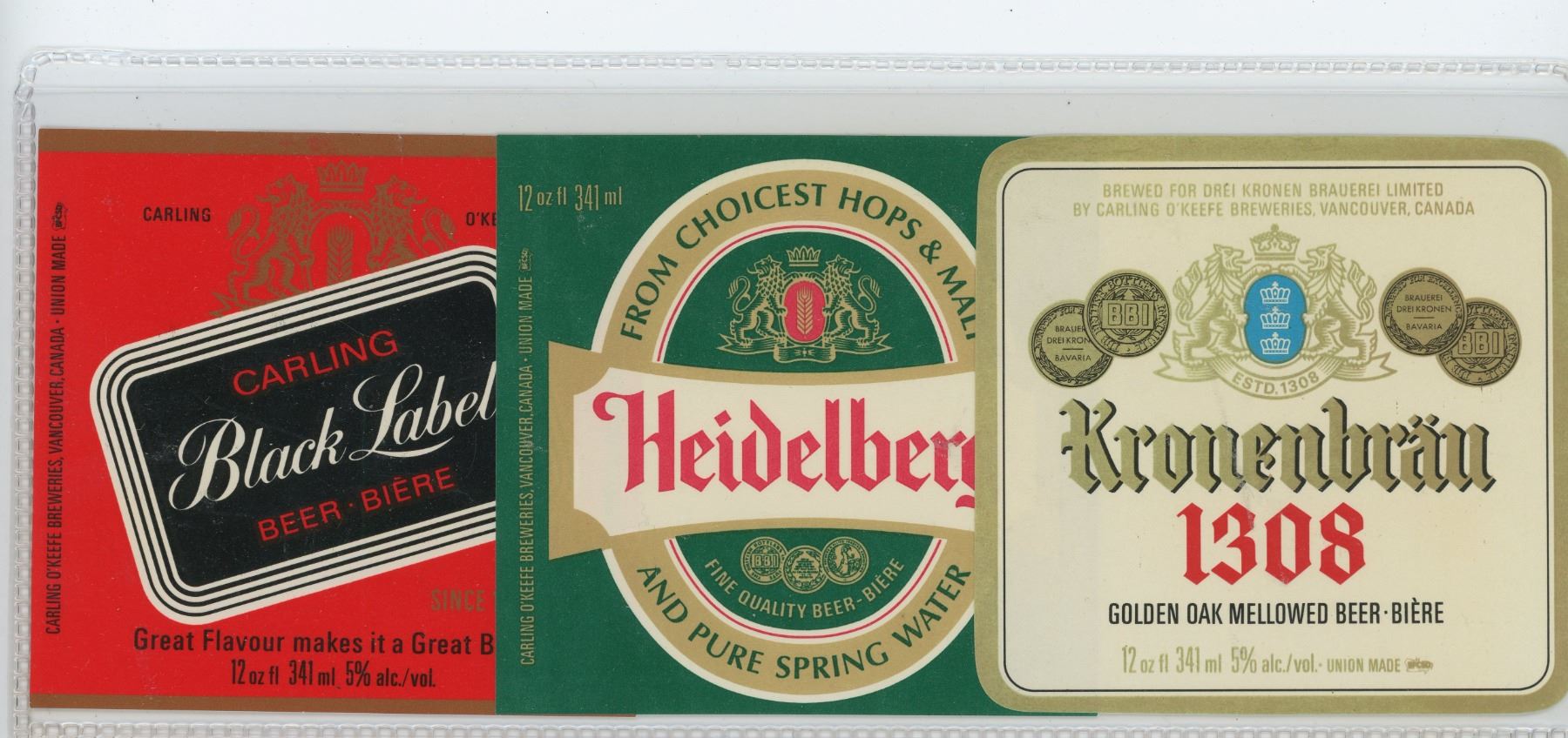 Lot of 3 different Carling-O’Keefe Beer Labels: Black Label, Heidelberg, Kronenbrau 1308. All Unc.