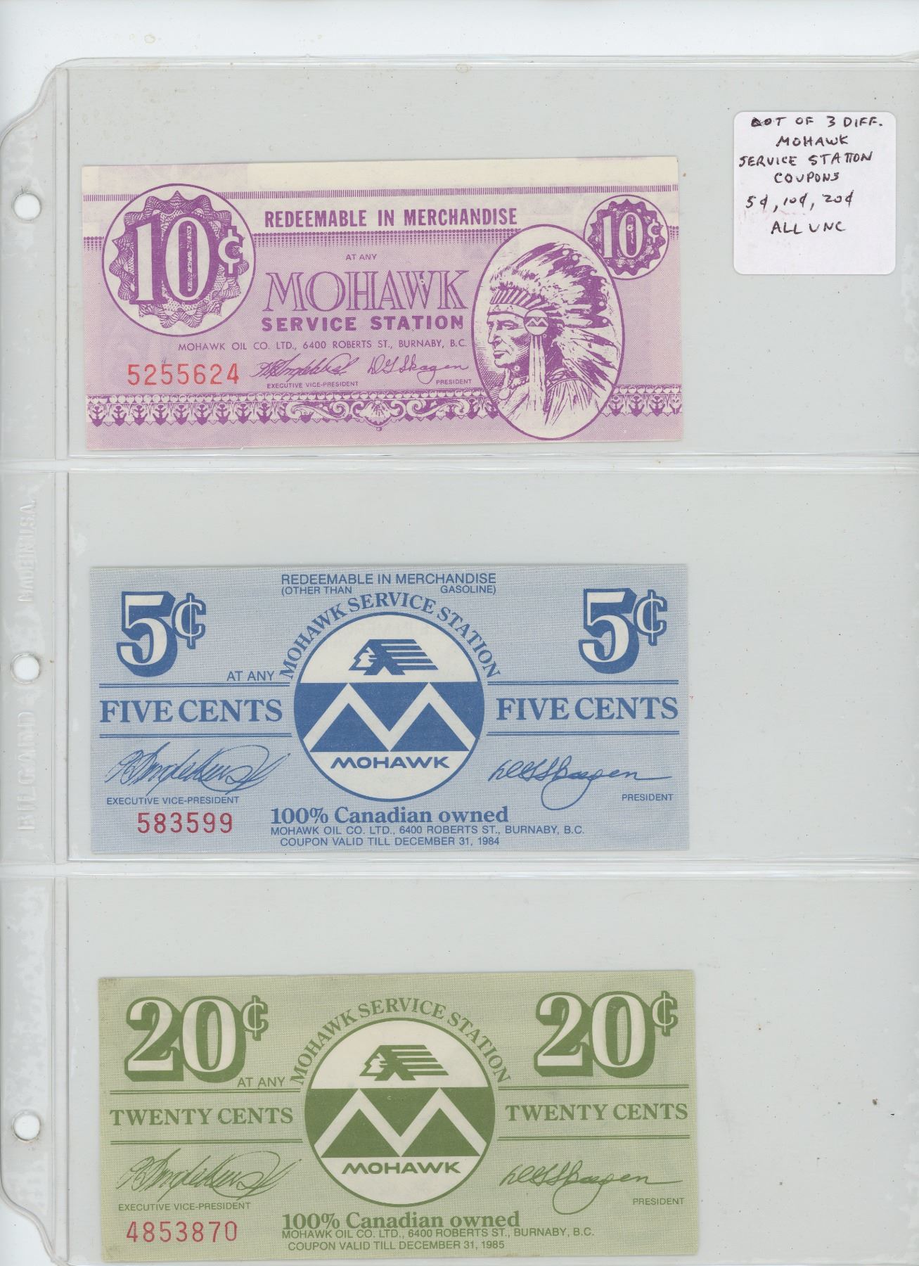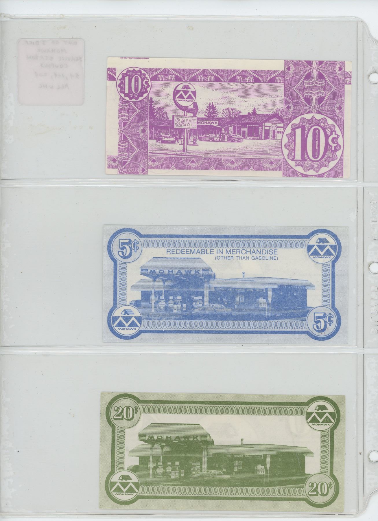 Lot of 3 different Mohawk Service Station Scrip: 5 cents, 10 cents, 20 cents. All Unc.