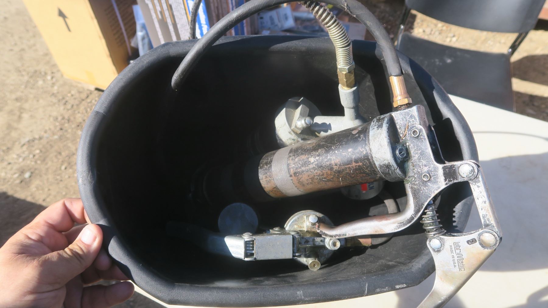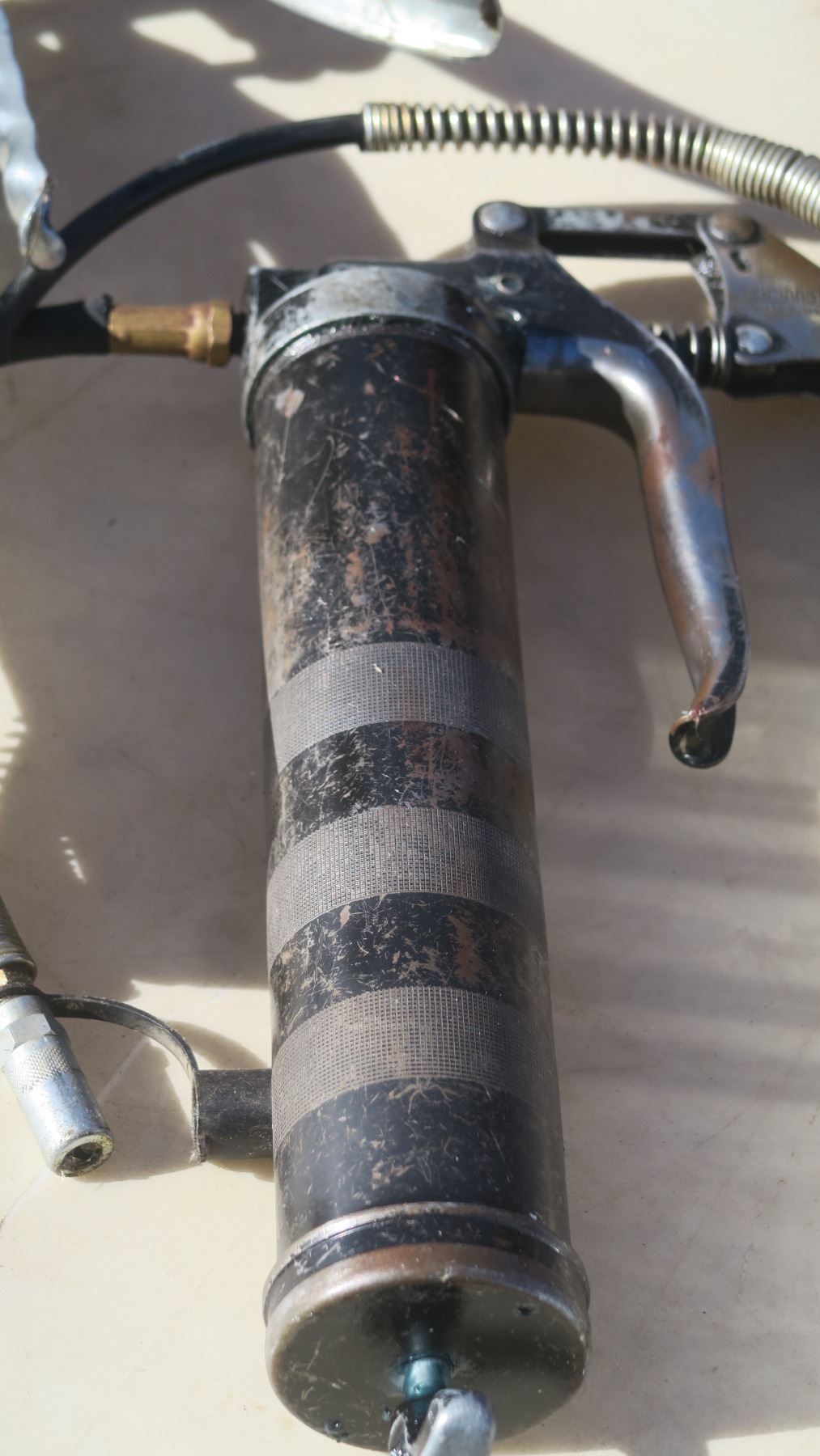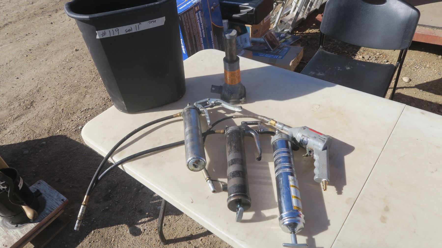 Lot of 3 - grease guns and small bottle jack in small black trash bin