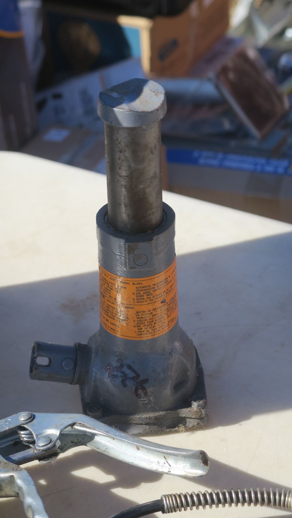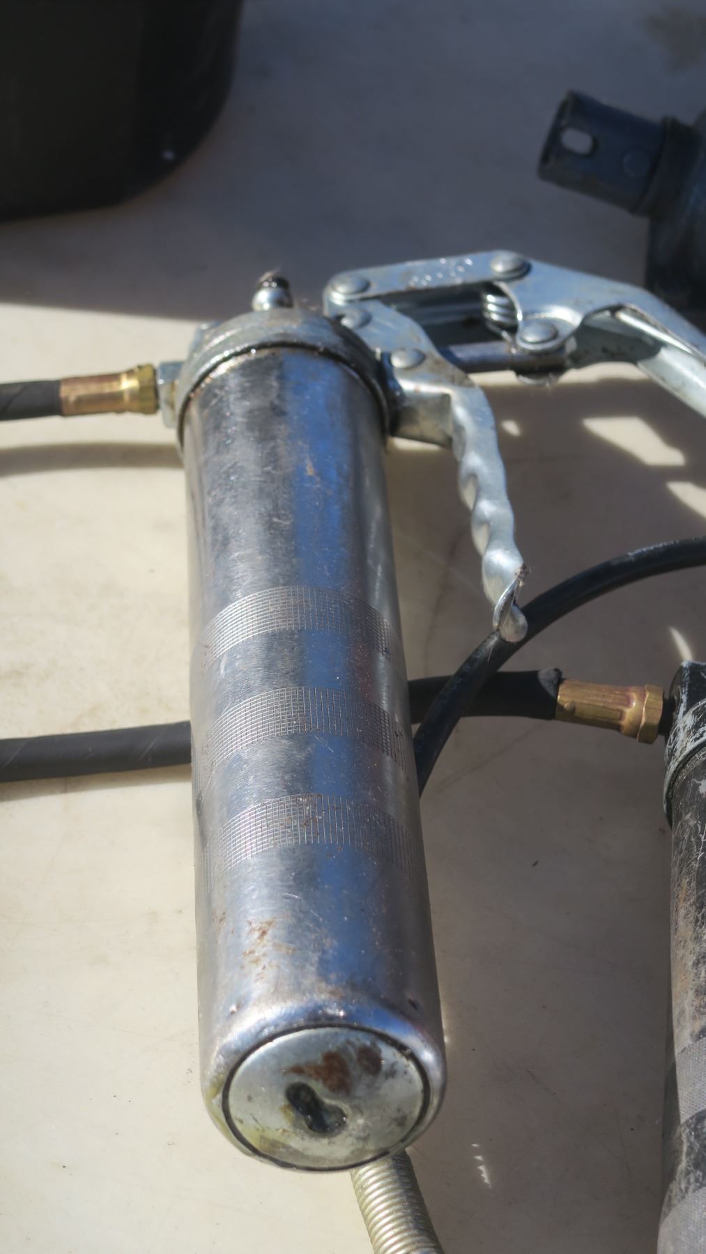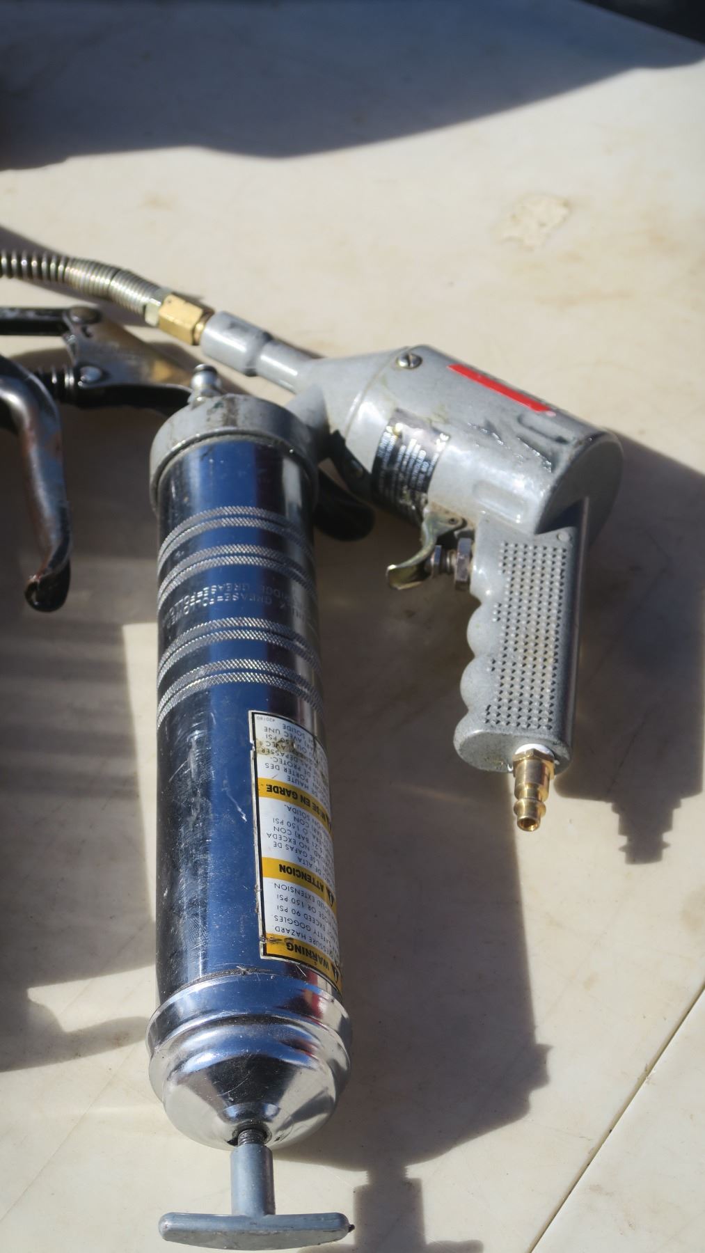 Lot of 3 - grease guns and small bottle jack in small black trash bin