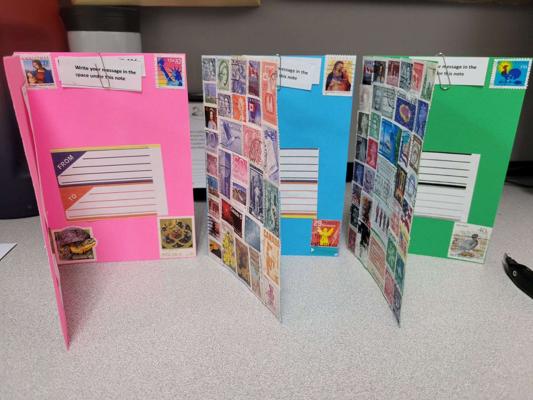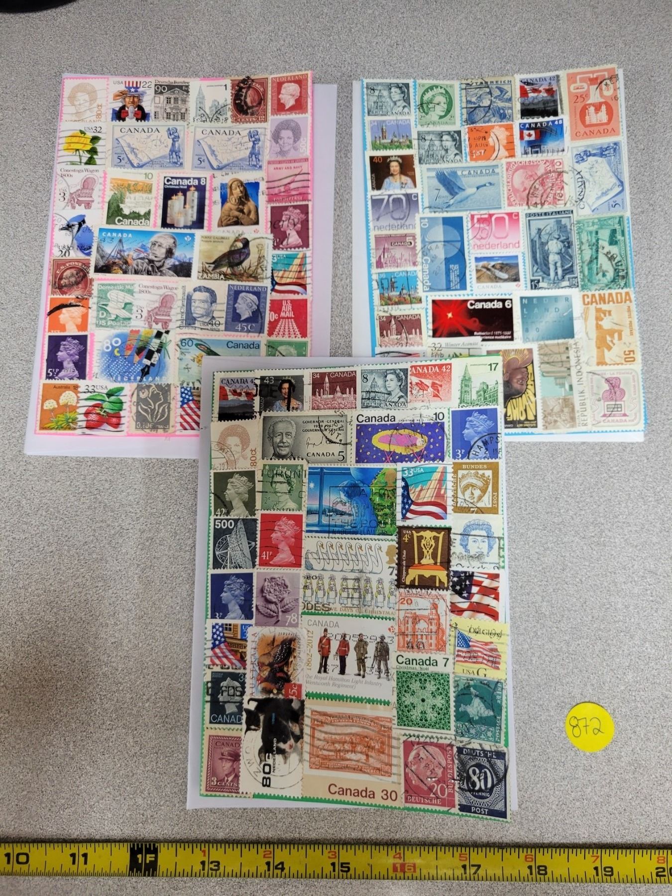 Lot of 3 hand made novelty greeting cards with envelopes! Covers made with beautiful world stamps, unique & very special gift