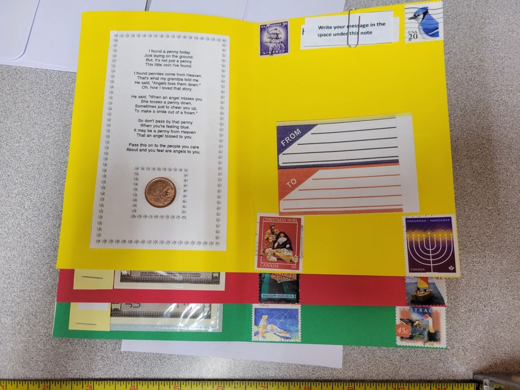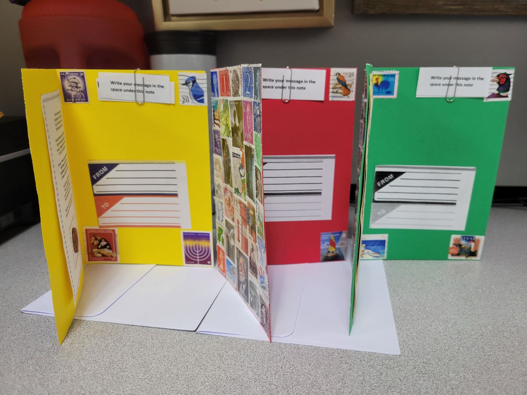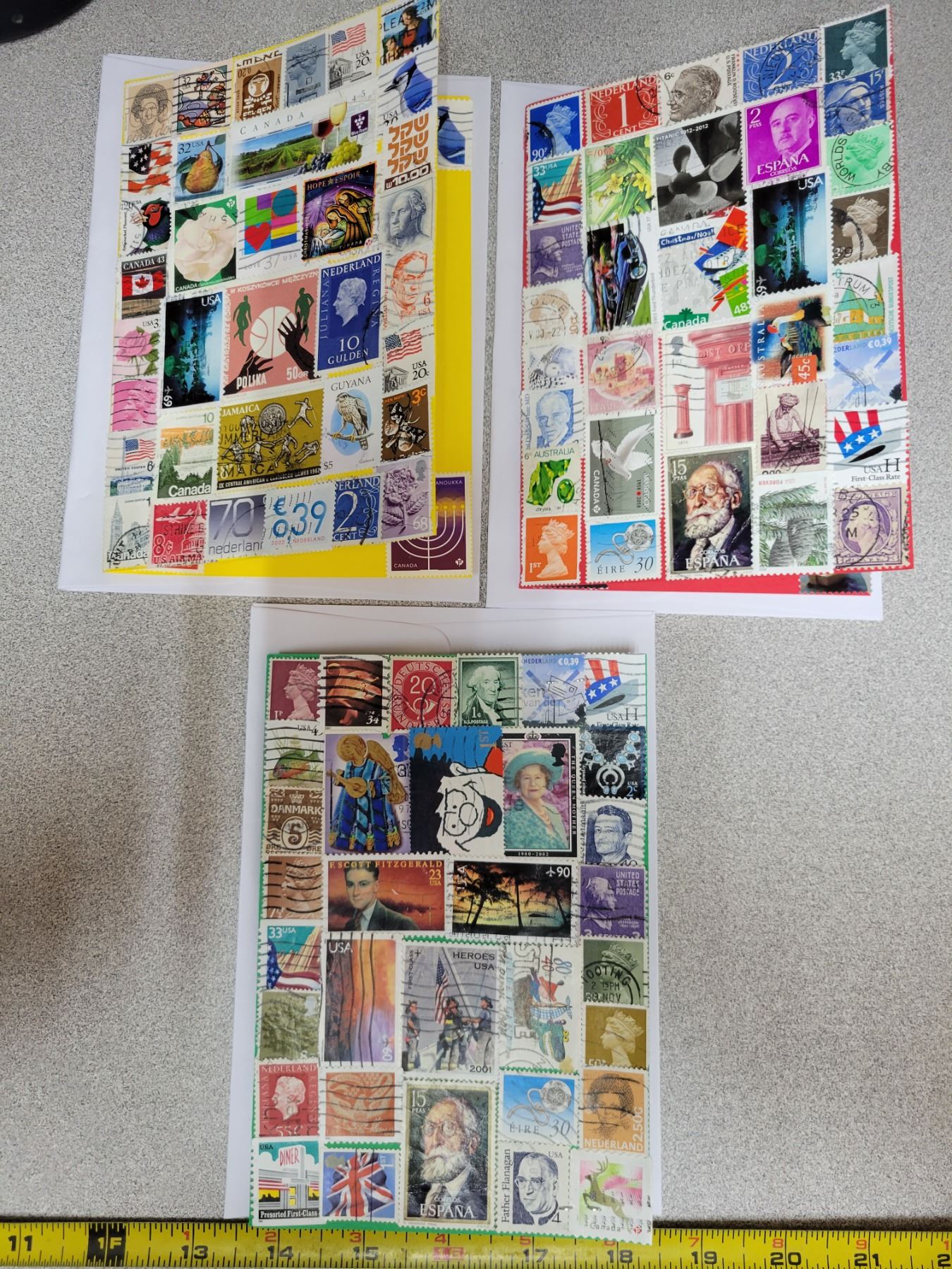 Lot of 3 hand made novelty greeting cards with envelopes! Covers made with beautiful world stamps, unique & very special gift