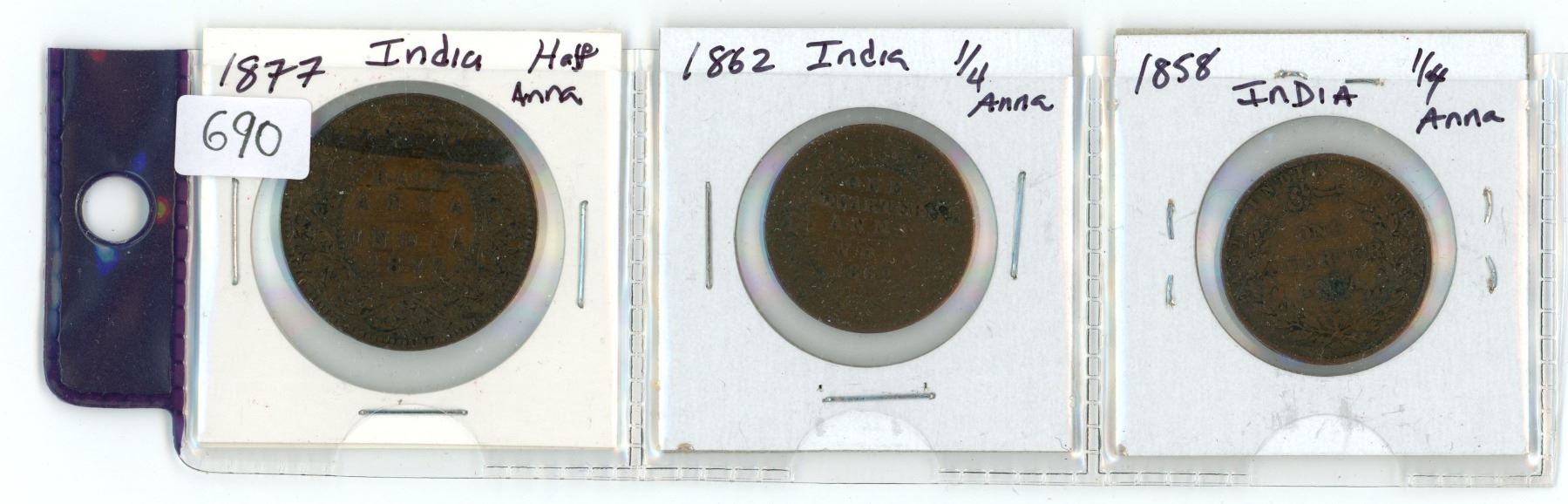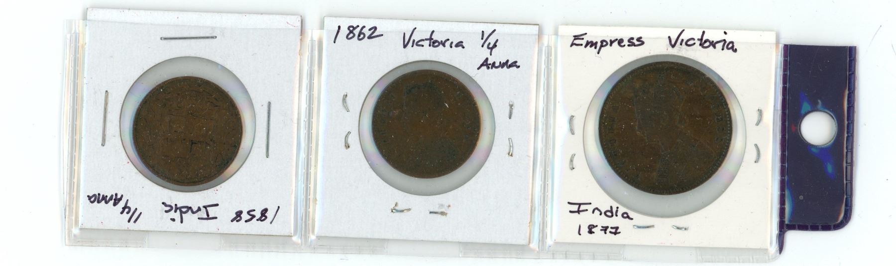 Lot of 3 india coins: 1877 half anna, 1862 1/4 anna and 1858 1/4 anna