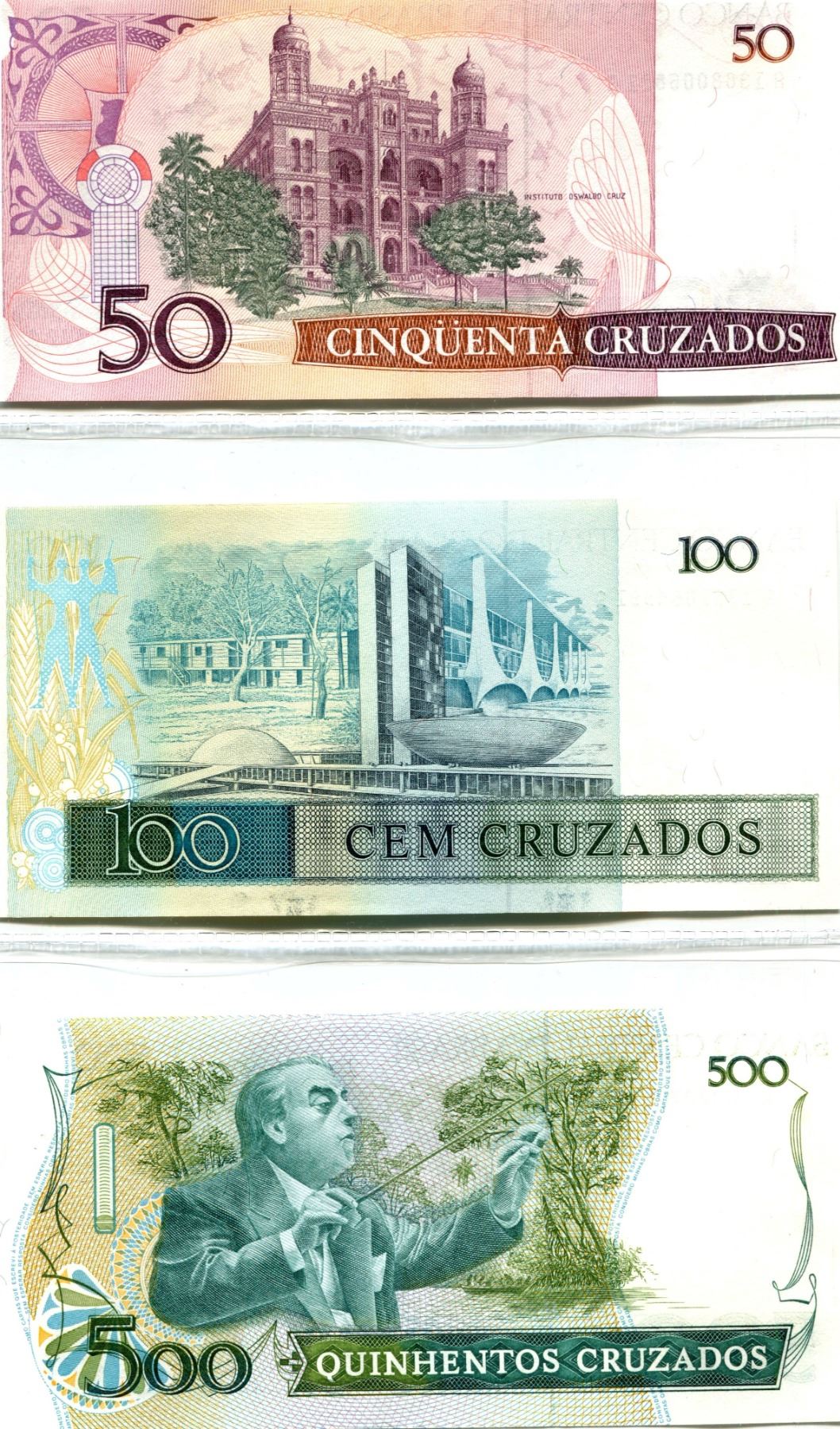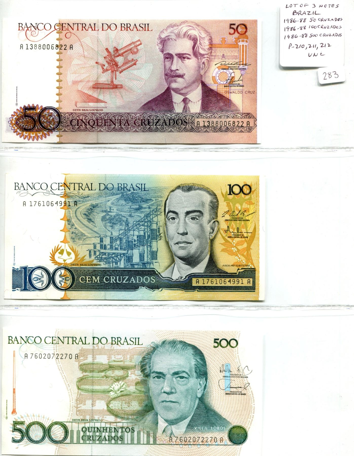 Lot of 3 notes from Brazil. Banco Central do Brasil. 1986-1988 50 Cruzados, 1986-1988 100 Cruzados, 1986-1988 500 Cruzados. P-210, P-211, P-212. All Unc.