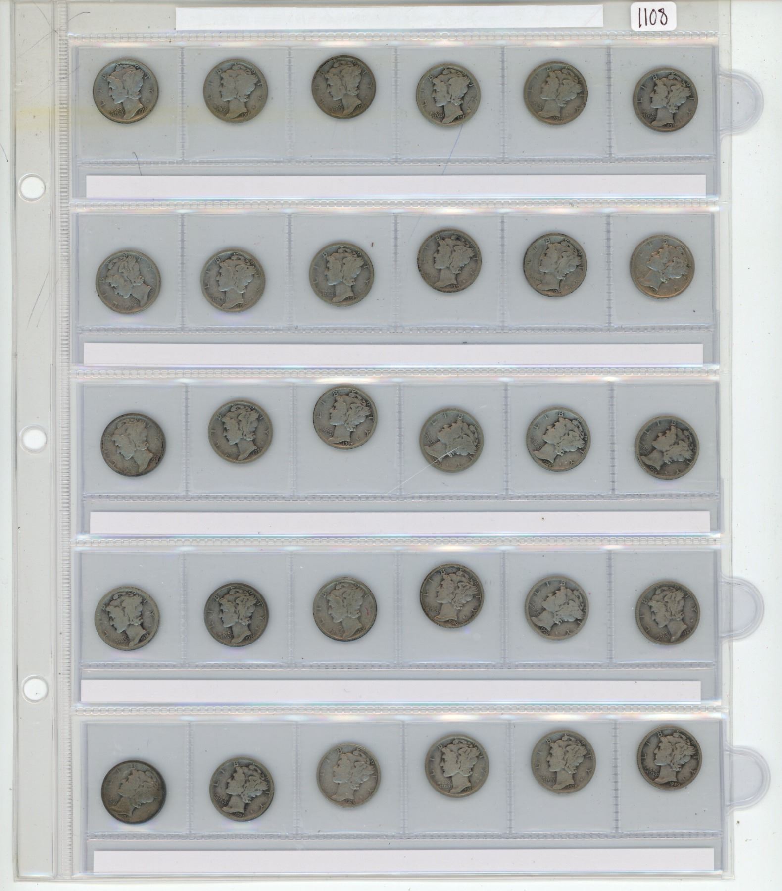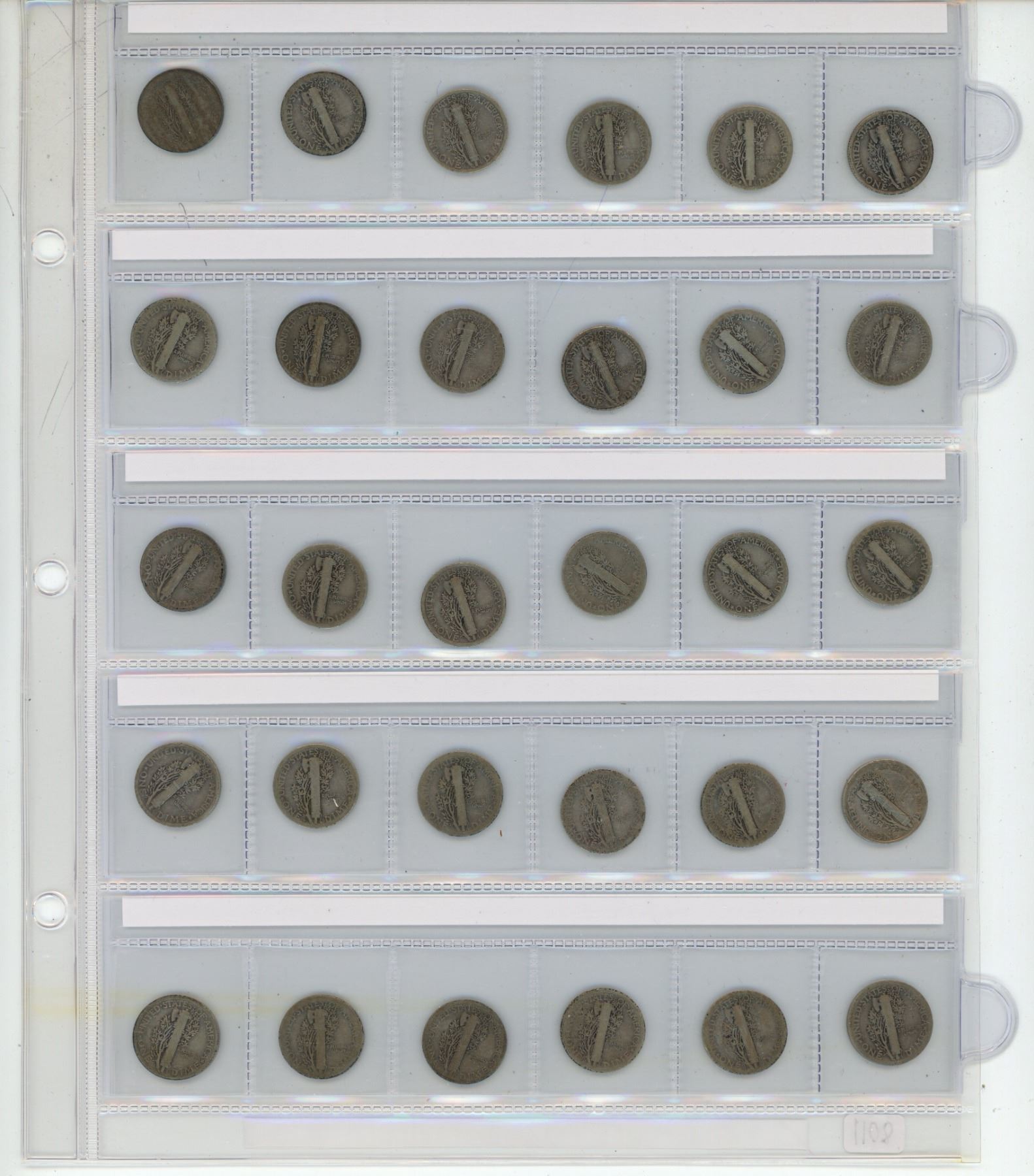 Lot of 30 early U.S. Silver Mercury Dimes. Includes 1916, 1916S, 1917, 1917D. 1917S, 1918, 1918D, 1918S, 1919, 1919D, 1919S, 1920, 1920D, 1920S, 1923, 1923S, 1924, 1924D, 1924S, 1925, 1925S, 1926, 1926D, 1927, 1927D, 1927S, 1928, 1928D, 1928S & 1929. Coins grade up to VF-20.