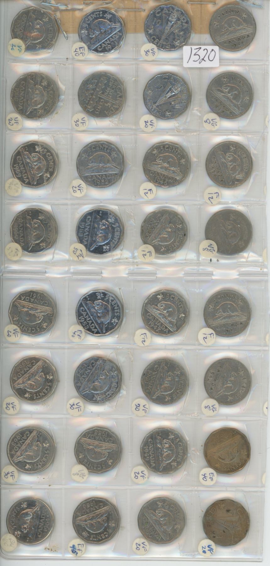 Lot of 32 Canadian George VI & Elizabeth Nickels: 1937 Dot to 1964. Includes all War-Time coins including both Tombacs. Coins grade VG-8 to EF-40.