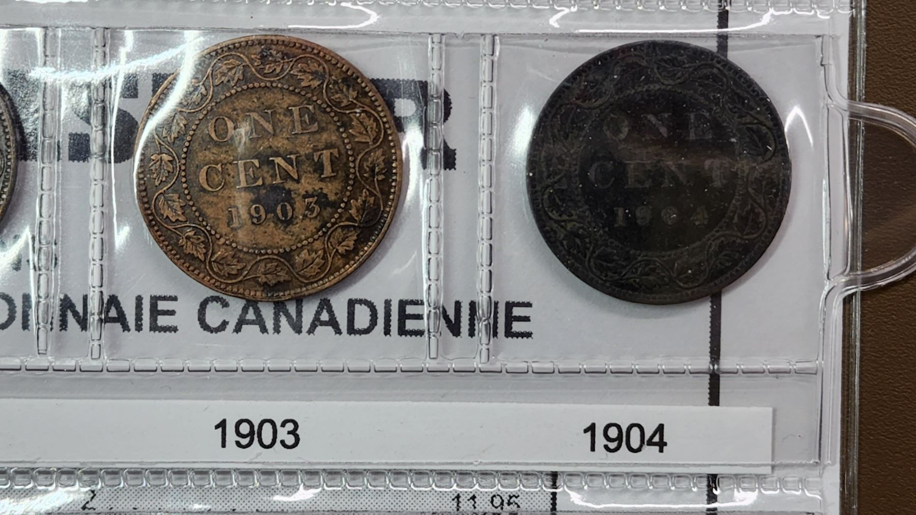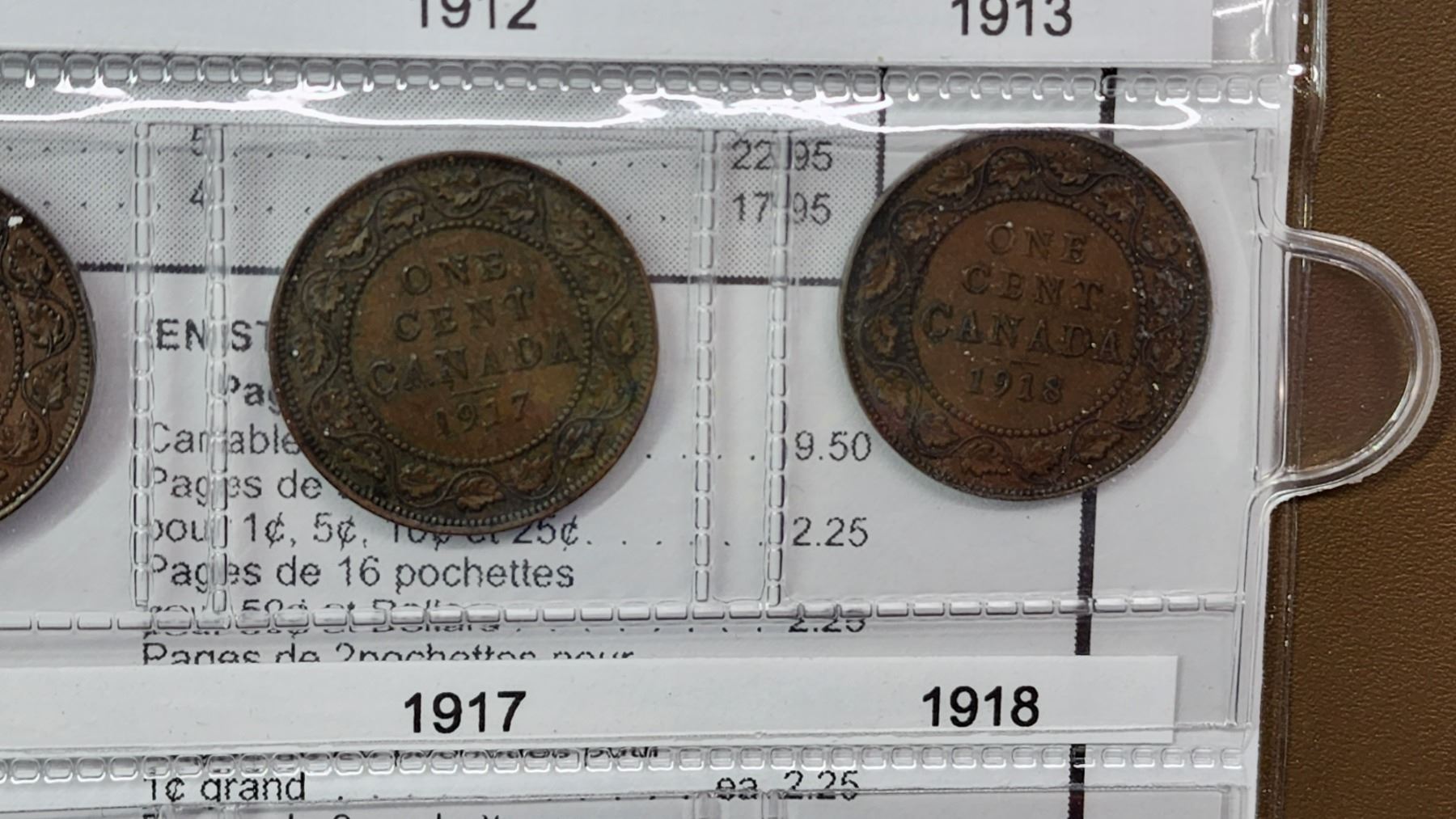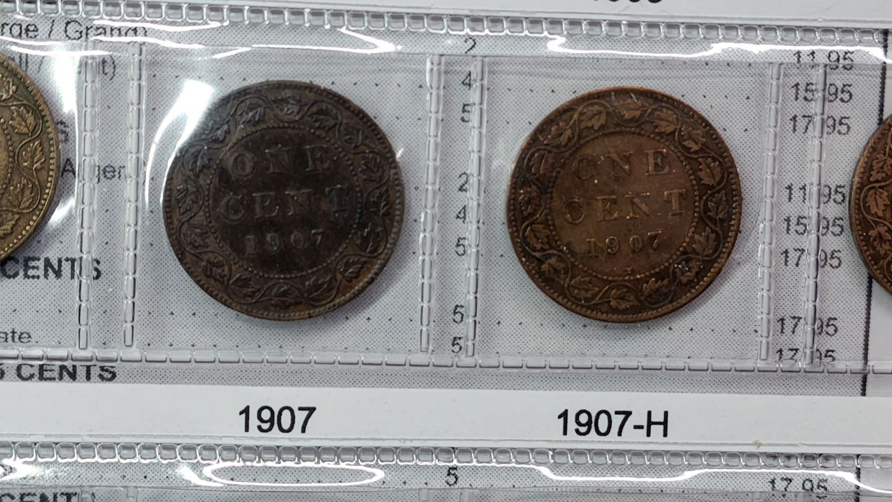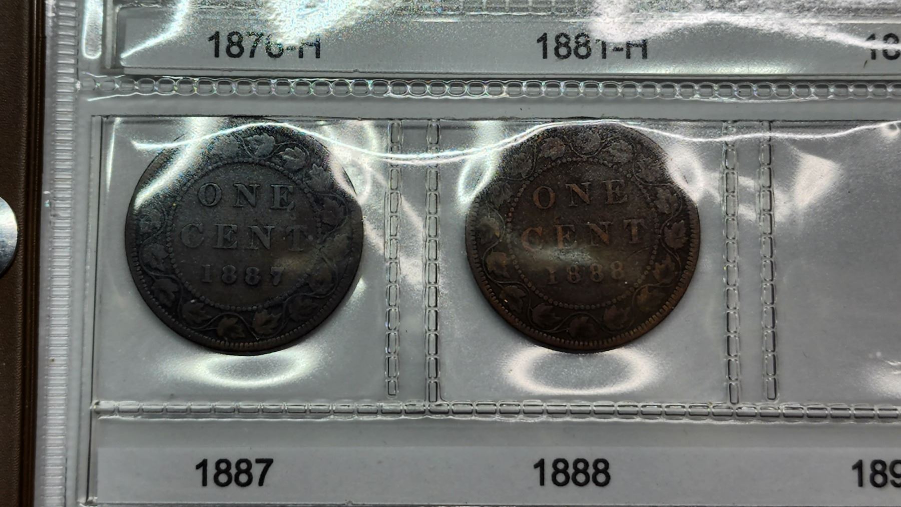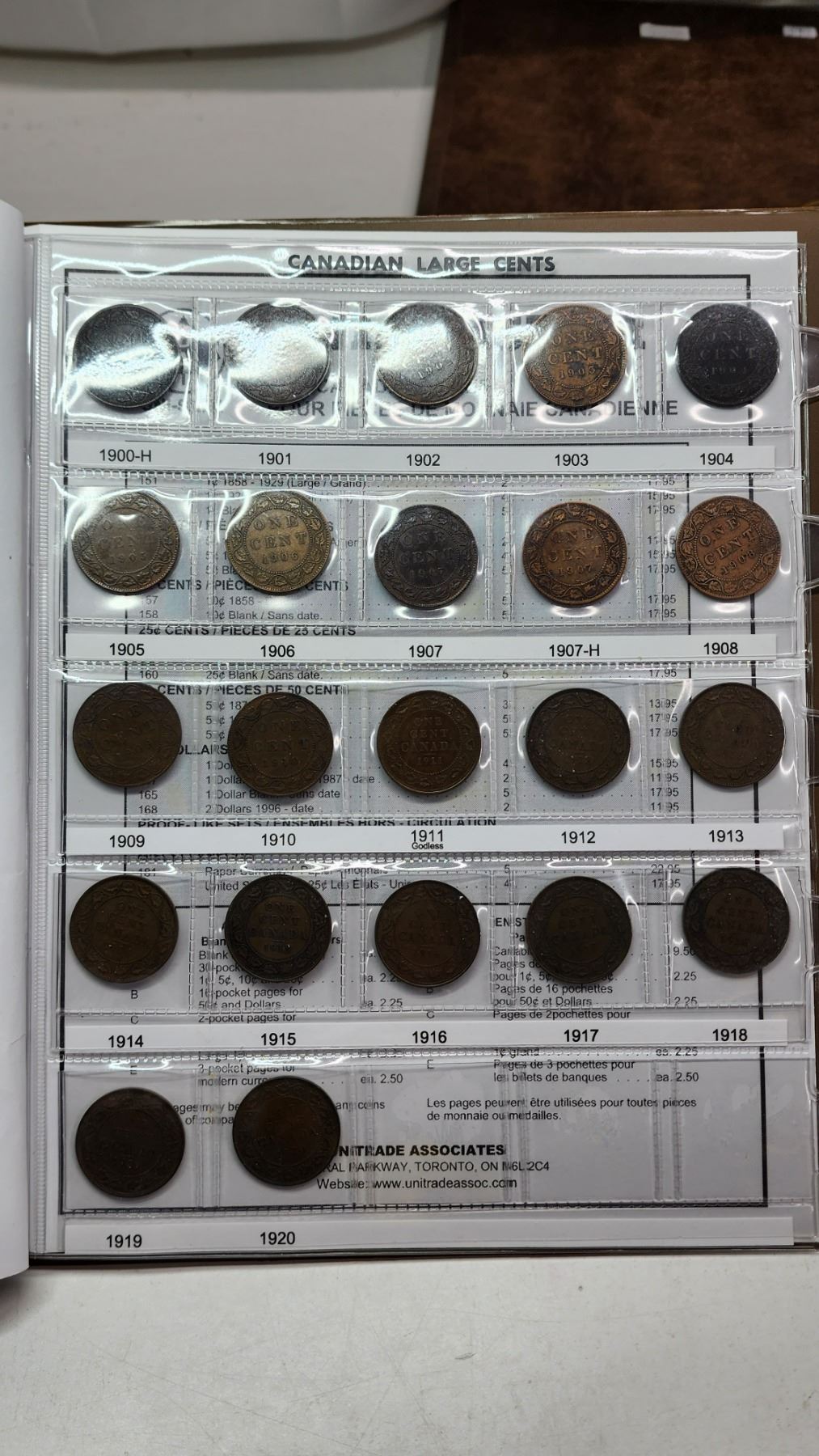 Lot of 39 Canadian Large Cents. Includes 1859 Narrow 9, 1876H, 1881H, 1882H, 1884, 1886, 1887, 1888, 1891, 1892, 1893, 1894, 1895, 1896, 1897, 1899, 1900, 1900H, 1901, 1902, 1903, 1904, 1905, 1906, 1907, 1907H, 1908, 1909, 1910, 1911, 1912, 1913, 1914, 1915, 1916, 1917, 1918, 1919 & 1920. Coins grade VG-8 to EF-40. Housed in a Uni-Safe Album. A nice selection.