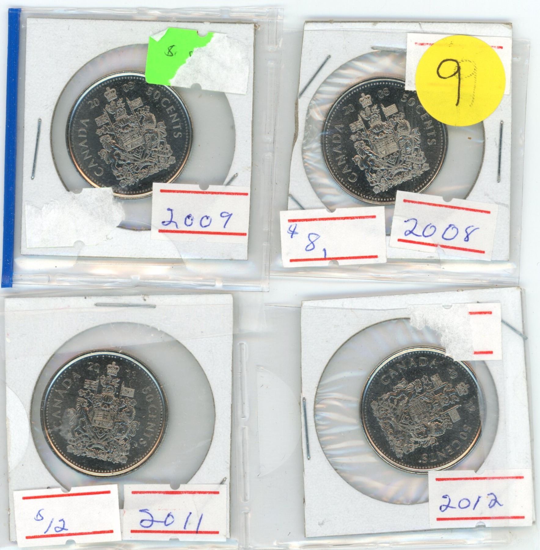 Lot of 4 (2008, 09, 11,2012) canadian 50 cent coins