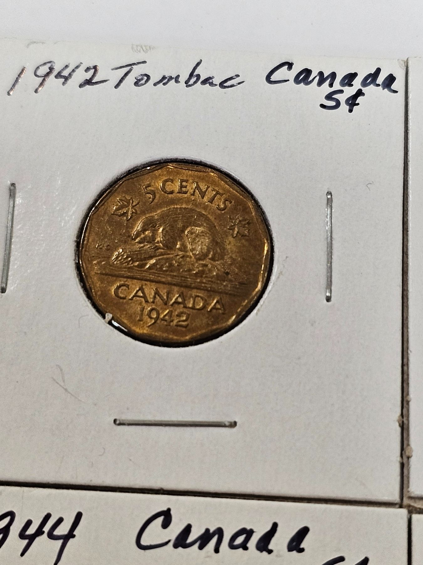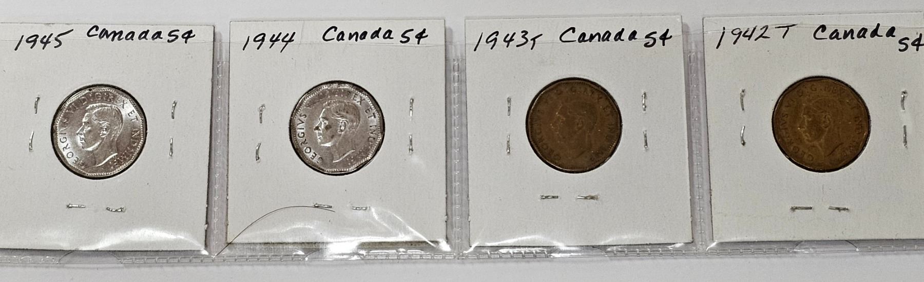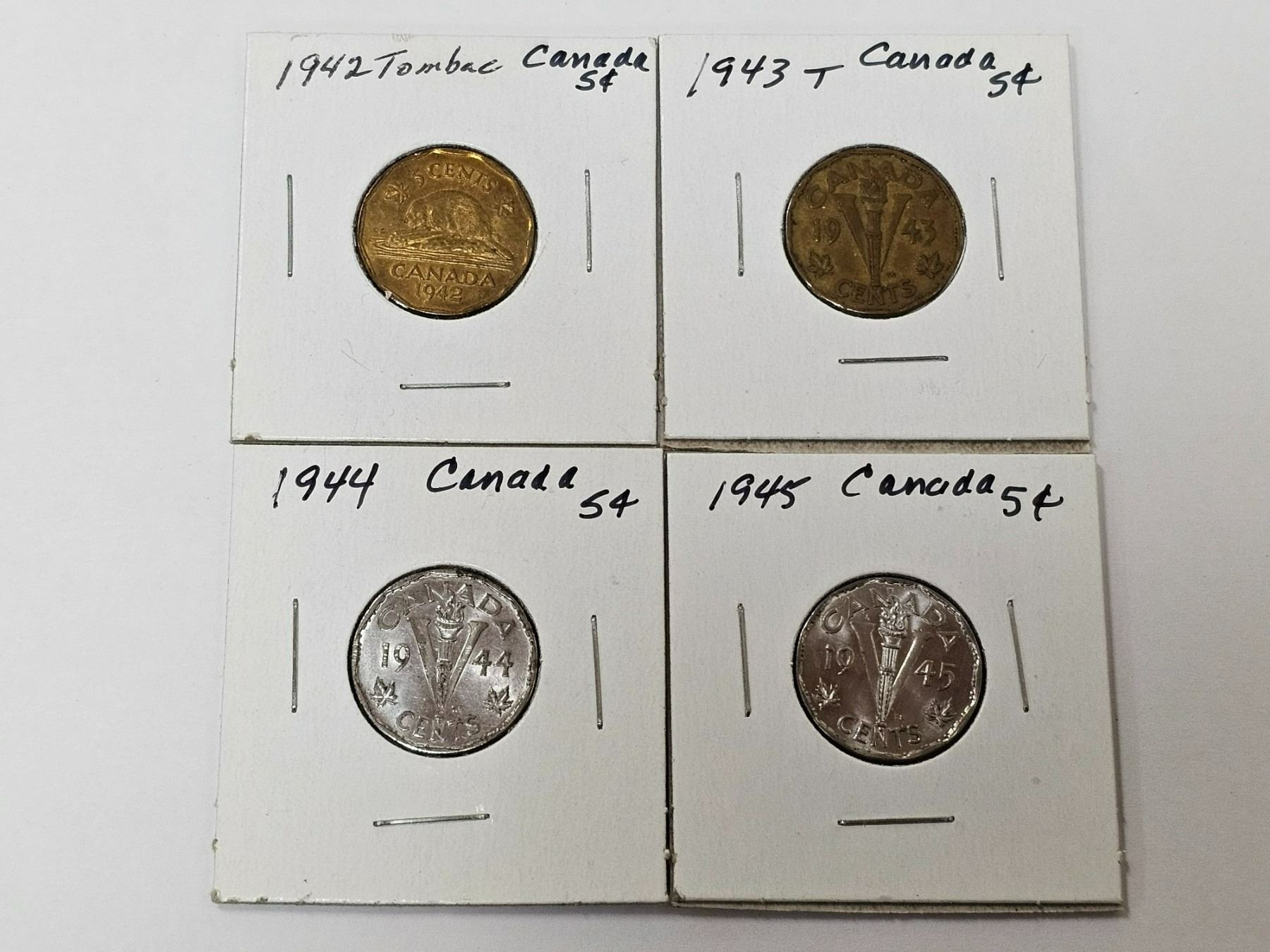 Lot of 4 Canada 5¢: 1942 Tombac, 1943 Tombac, 1944, 1945