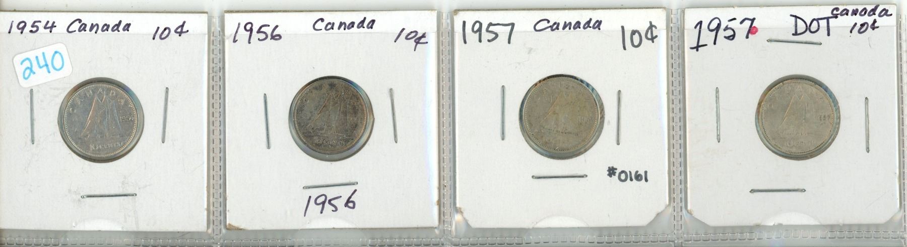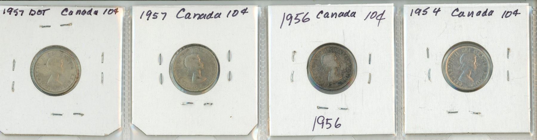 Lot of 4 Canada Silver 10¢: 1954, 1956, 1957, 1957 DOT
