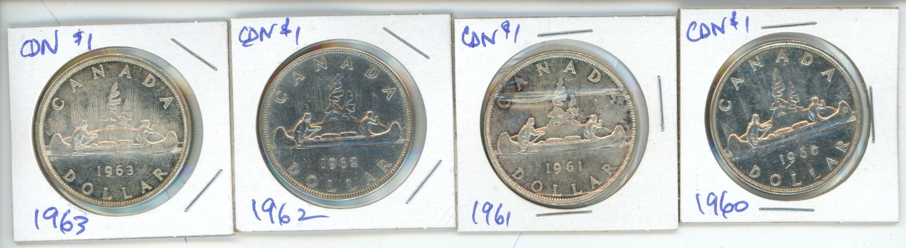 Lot of 4 Canadian Silver Dollars 1964/1965/1966/1968 AU to UNC