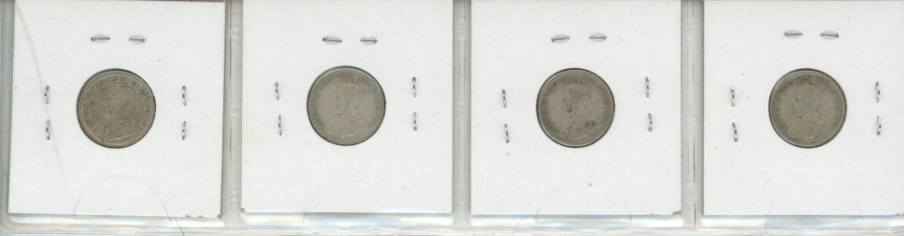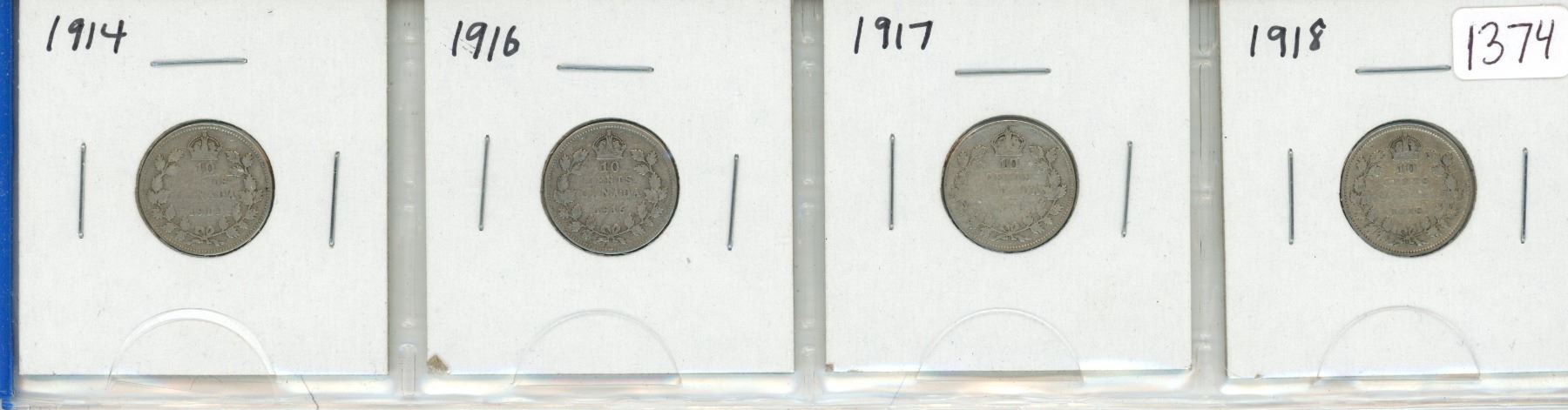 Lot of 4 Canadian World War I Silver 10 Cents. Includes 1914, 1916, 1917 & 1918. Coins grade VG or better.