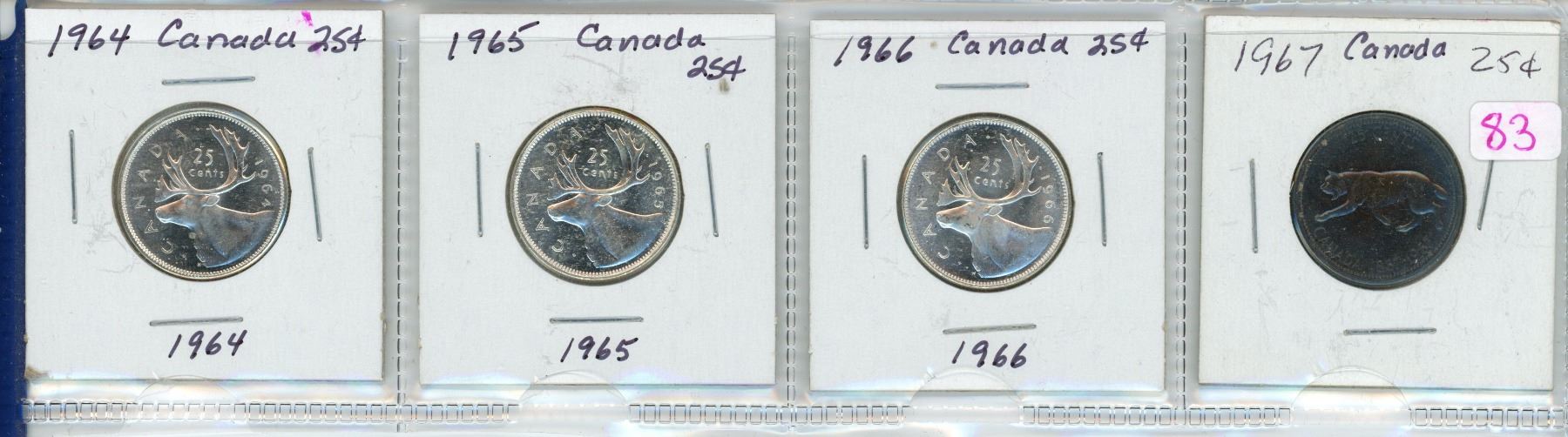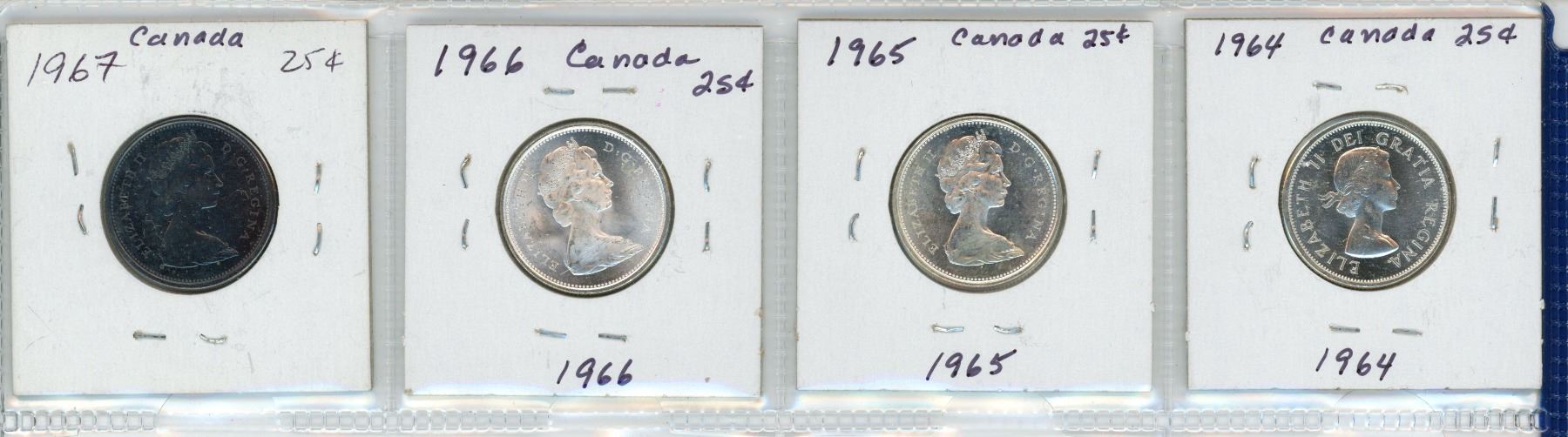 Lot of 4, Canadian silver 25 cent coins - 1964-67