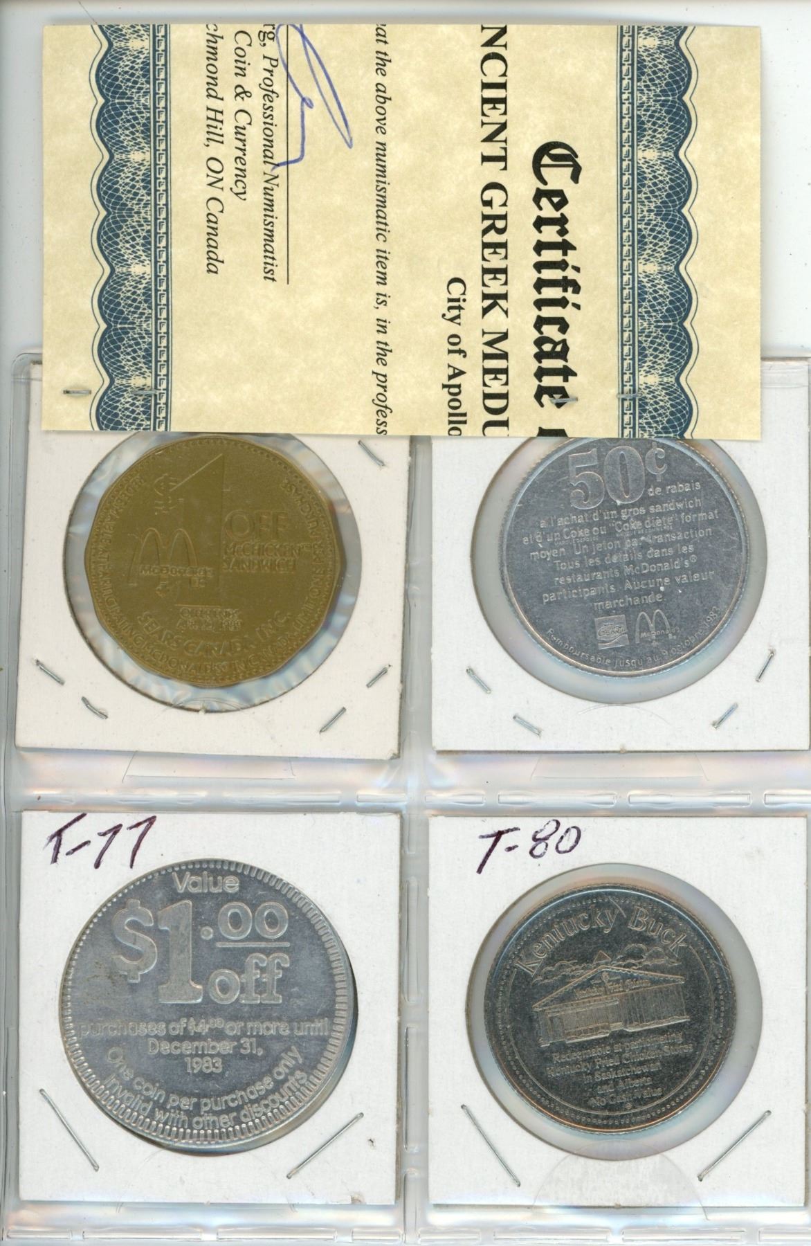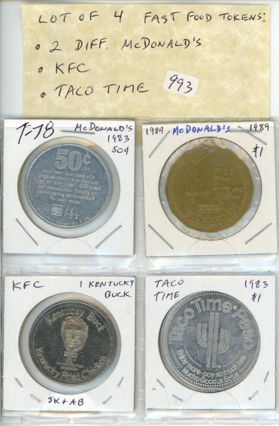 Lot of 4 Fast Food Tokens: 2 different McDonald’s, Kentucky Fried Chicken and Taco Time. All Unc.