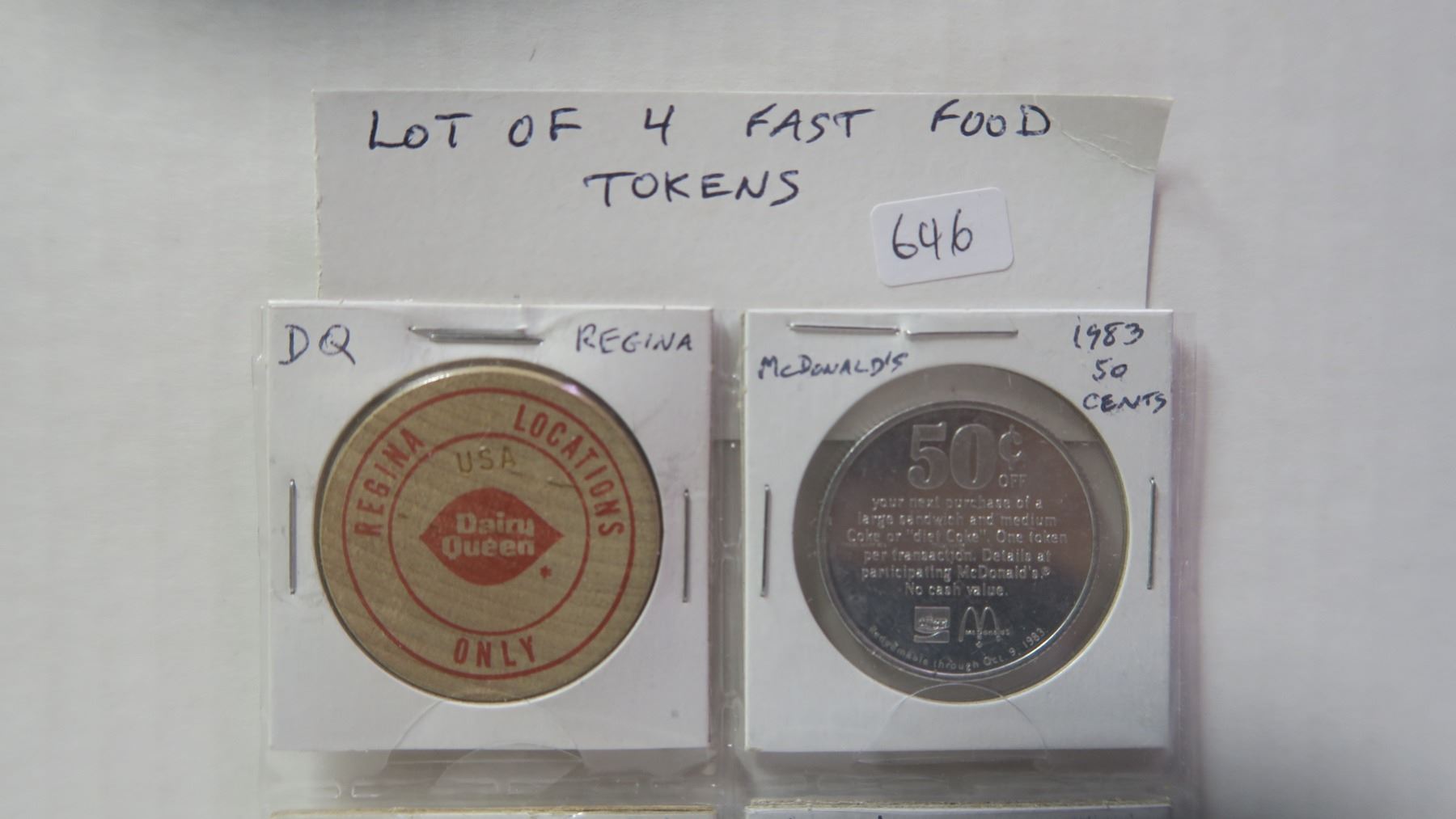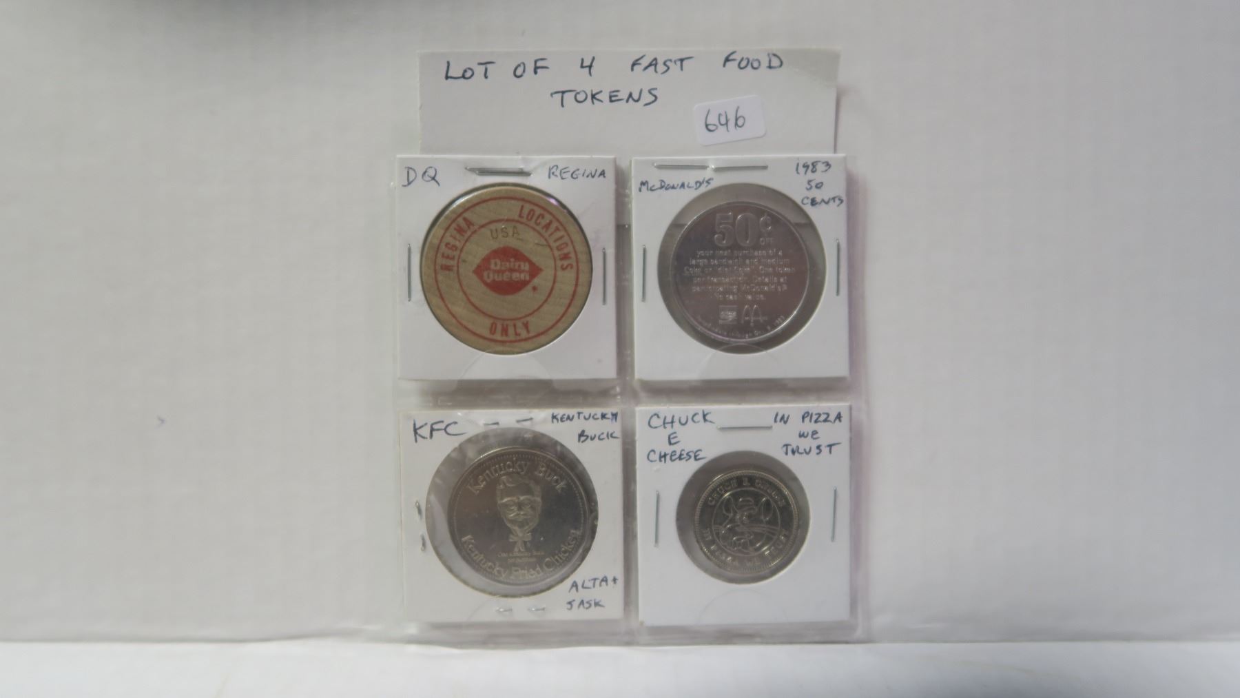Lot of 4 Fast Food Tokens. Includes Dairy Queen, McDonald’s, Kentucky Fried Chicken & Chuck E Cheese.