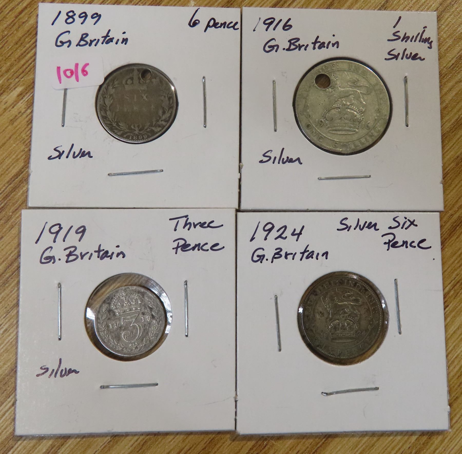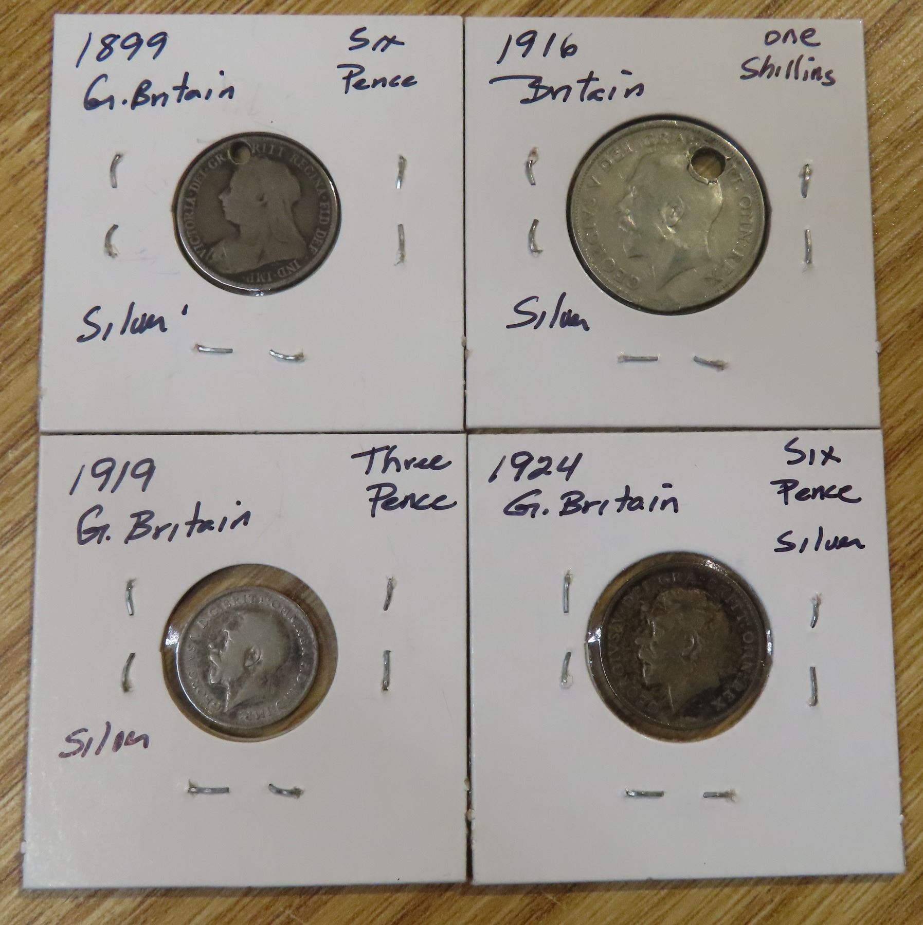 Lot of 4 Great Britain Silver Coins: 1899 Six Pence, 1916 One Shilling, 1924 Six Pence, 1919 Three