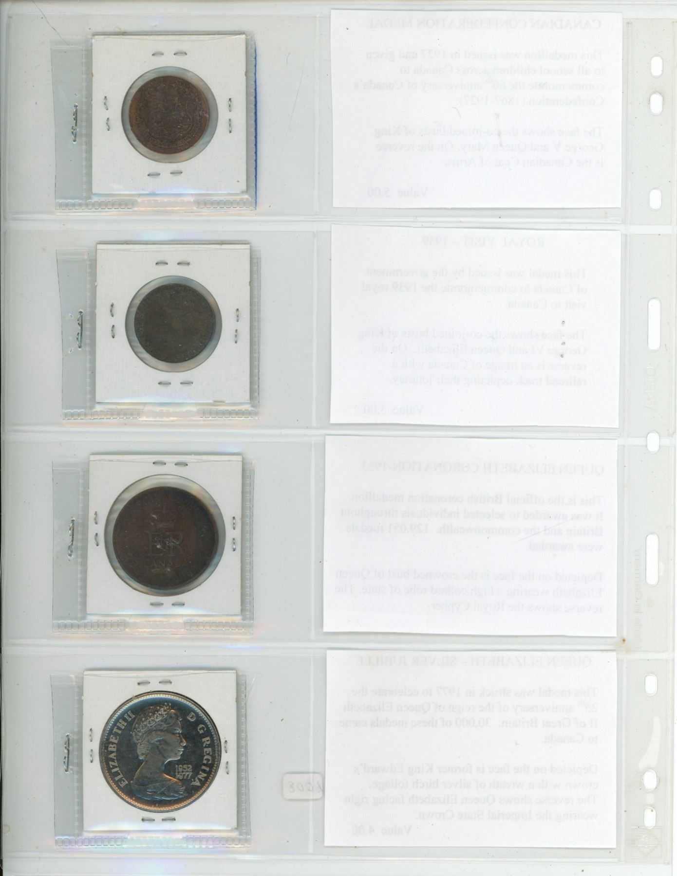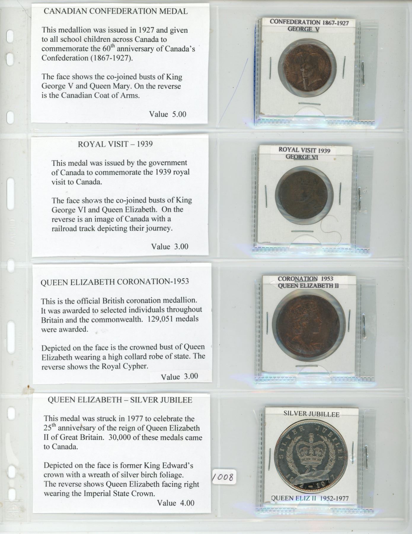 Lot of 4 Important Canadian Milestone medals: 1867-1927 Confederation medal, 1939 Royal Visit to Canada medal, 1953 Canadian Queen Elizabeth Coronation medal and 1977 Queen Elizabeth Silver Jubilee medal. All Unc.