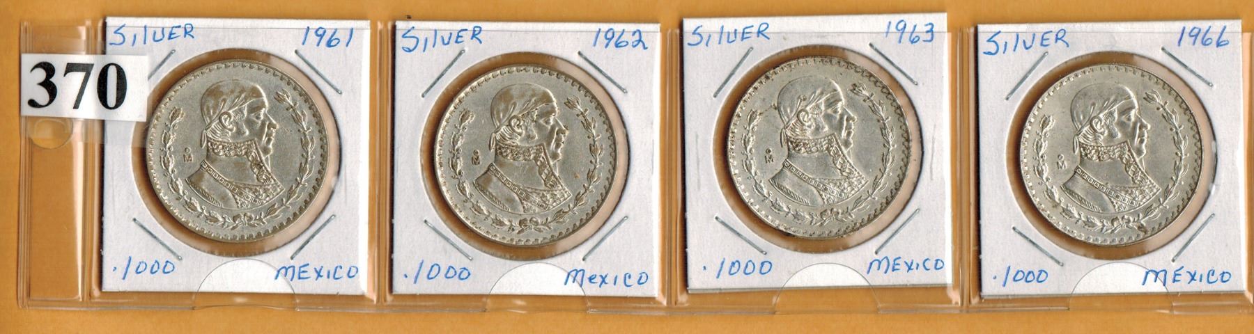 Lot of 4 Mexico Silver 1 Peso Coins (1961, 1962, 1963, 1966) - All Silver