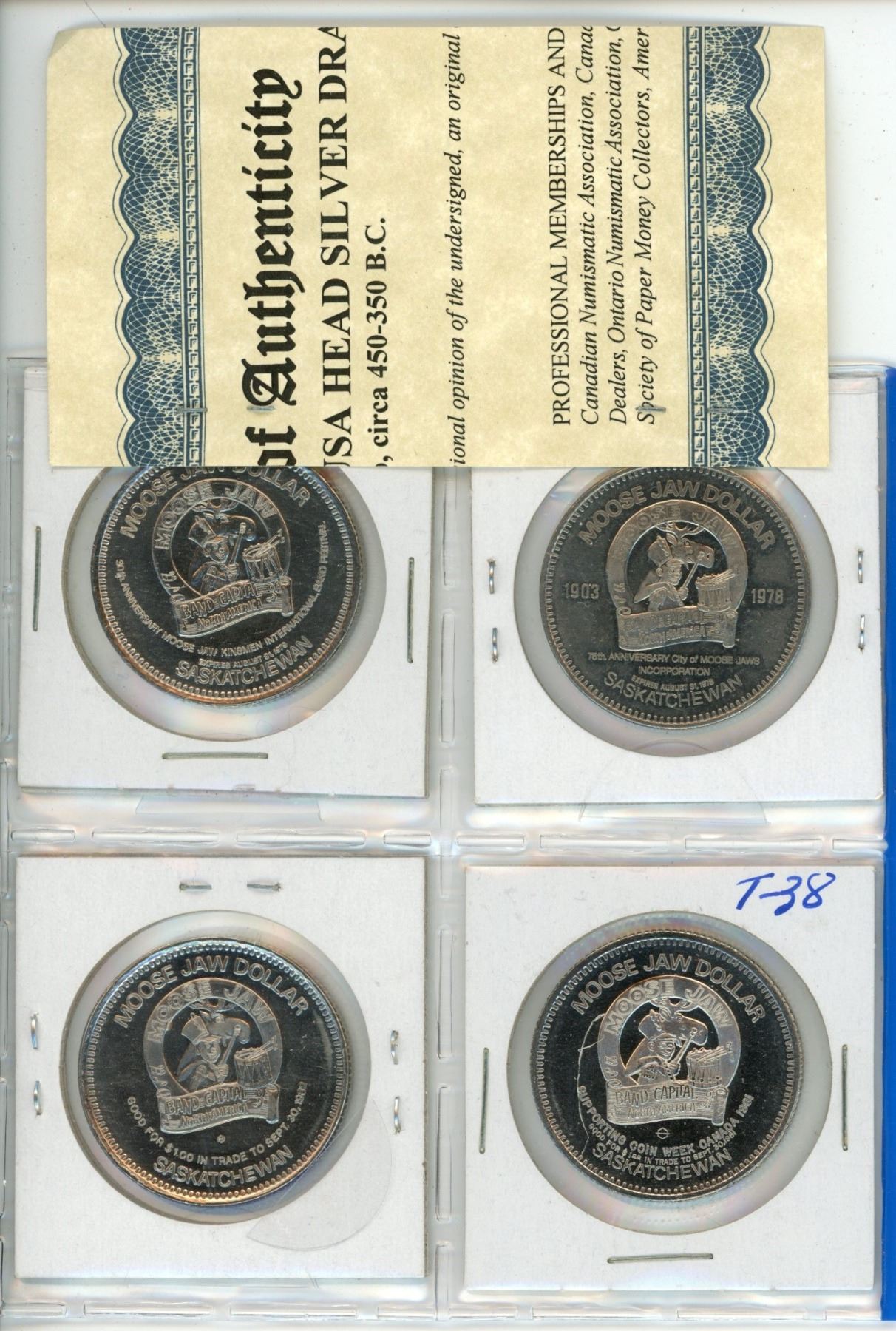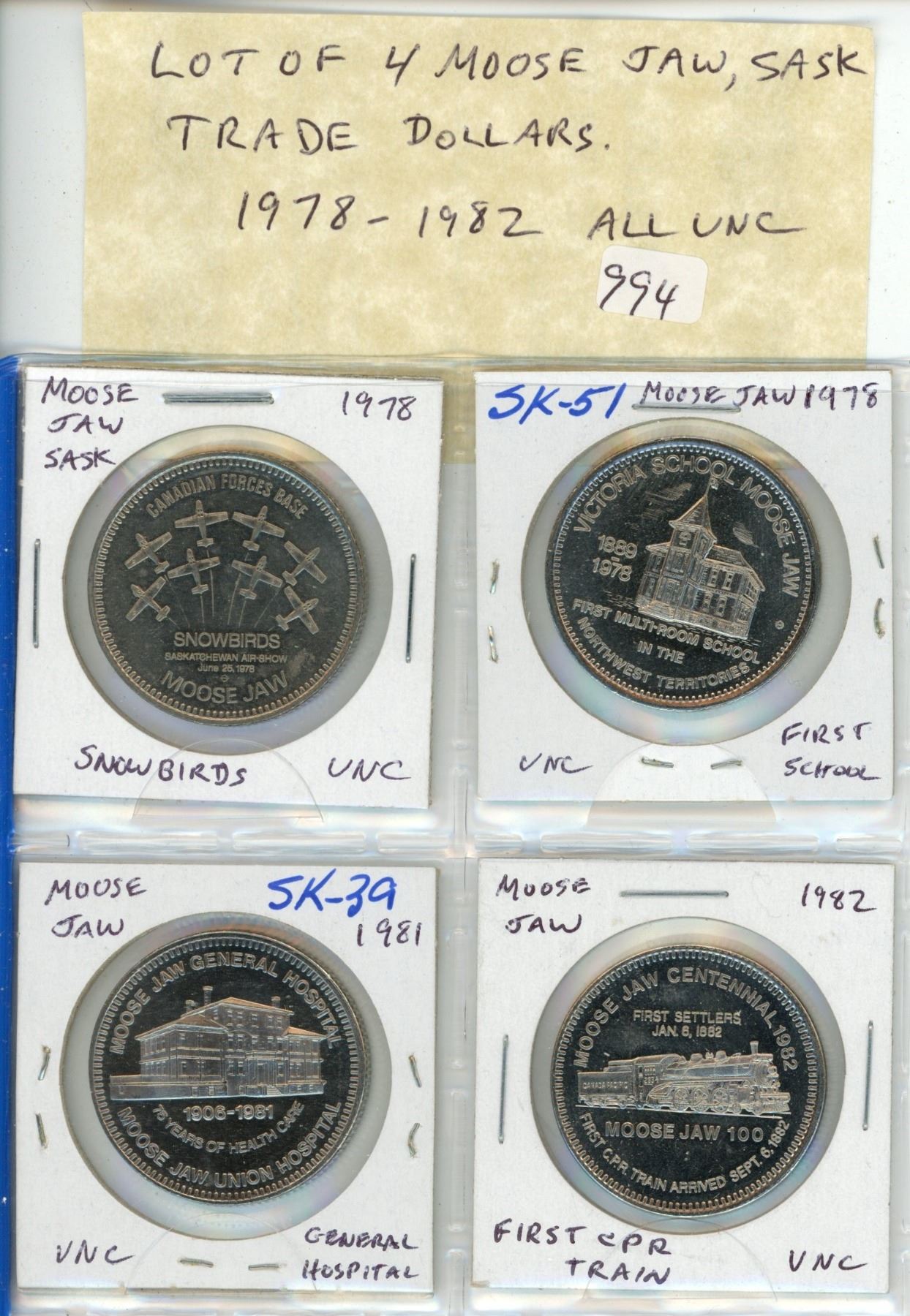 Lot of 4 Moose Jaw, Sask. Trade Dollars. 1978-1982. Includes Snow Birds, First School, General Hospi