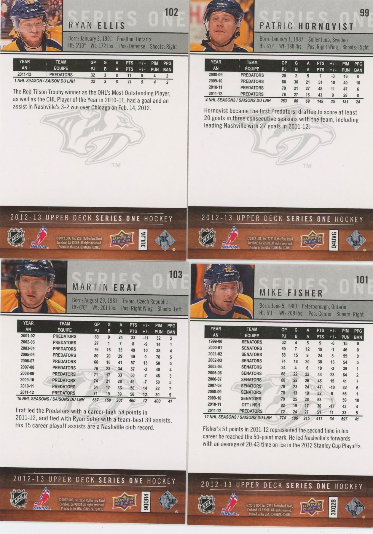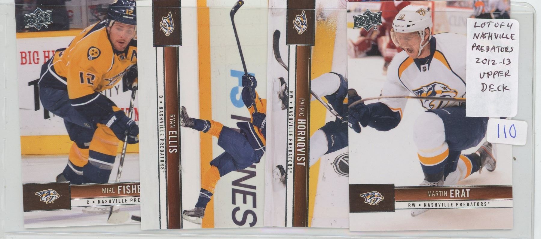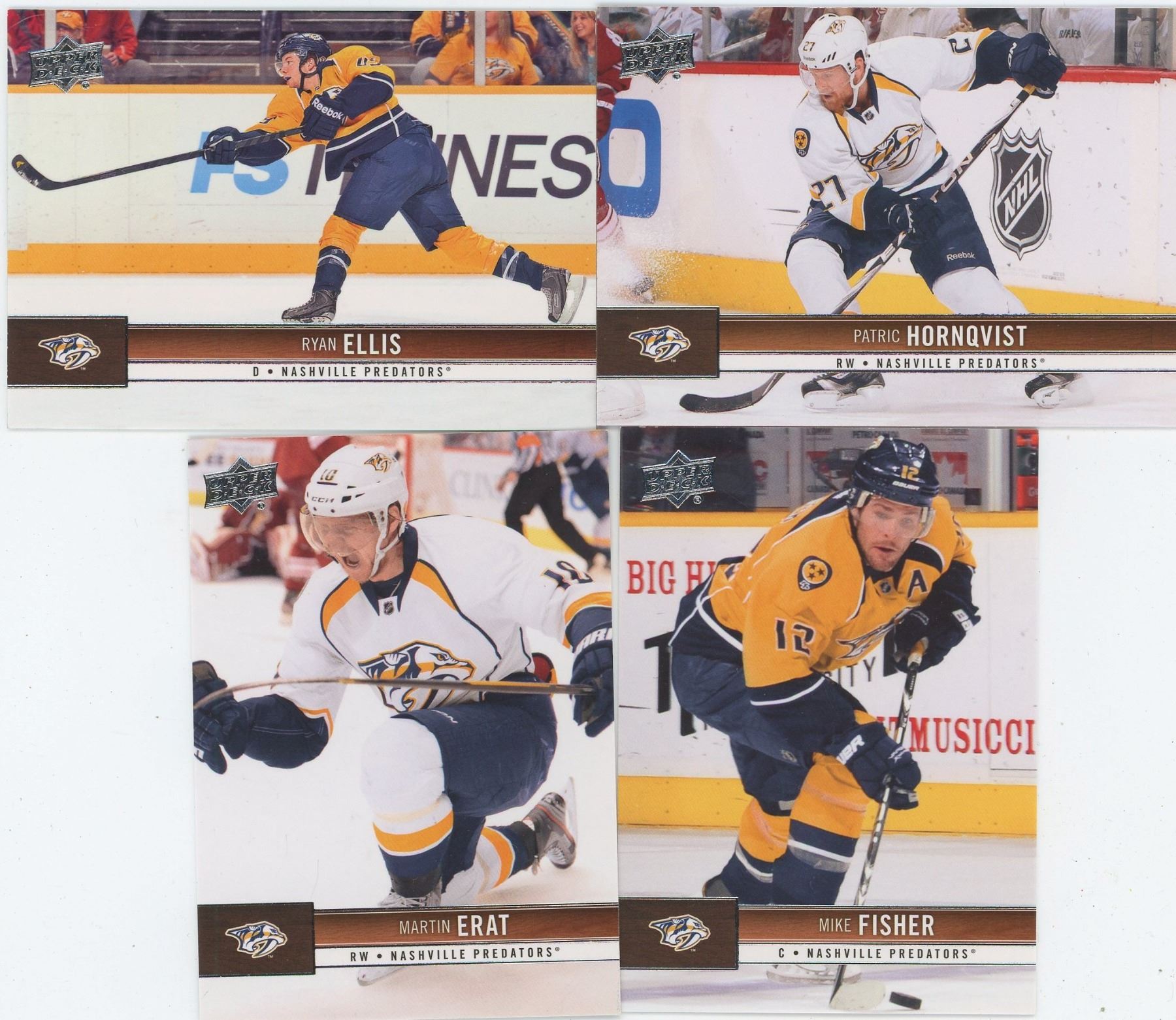 Lot of 4 Nashville Preditors, NHL Hockey cards including Mike Fisher, Ryan Ellis, Patric Hornqvist & Martin Erat. All 2012-13 Upper Deck. All Gem Unc.