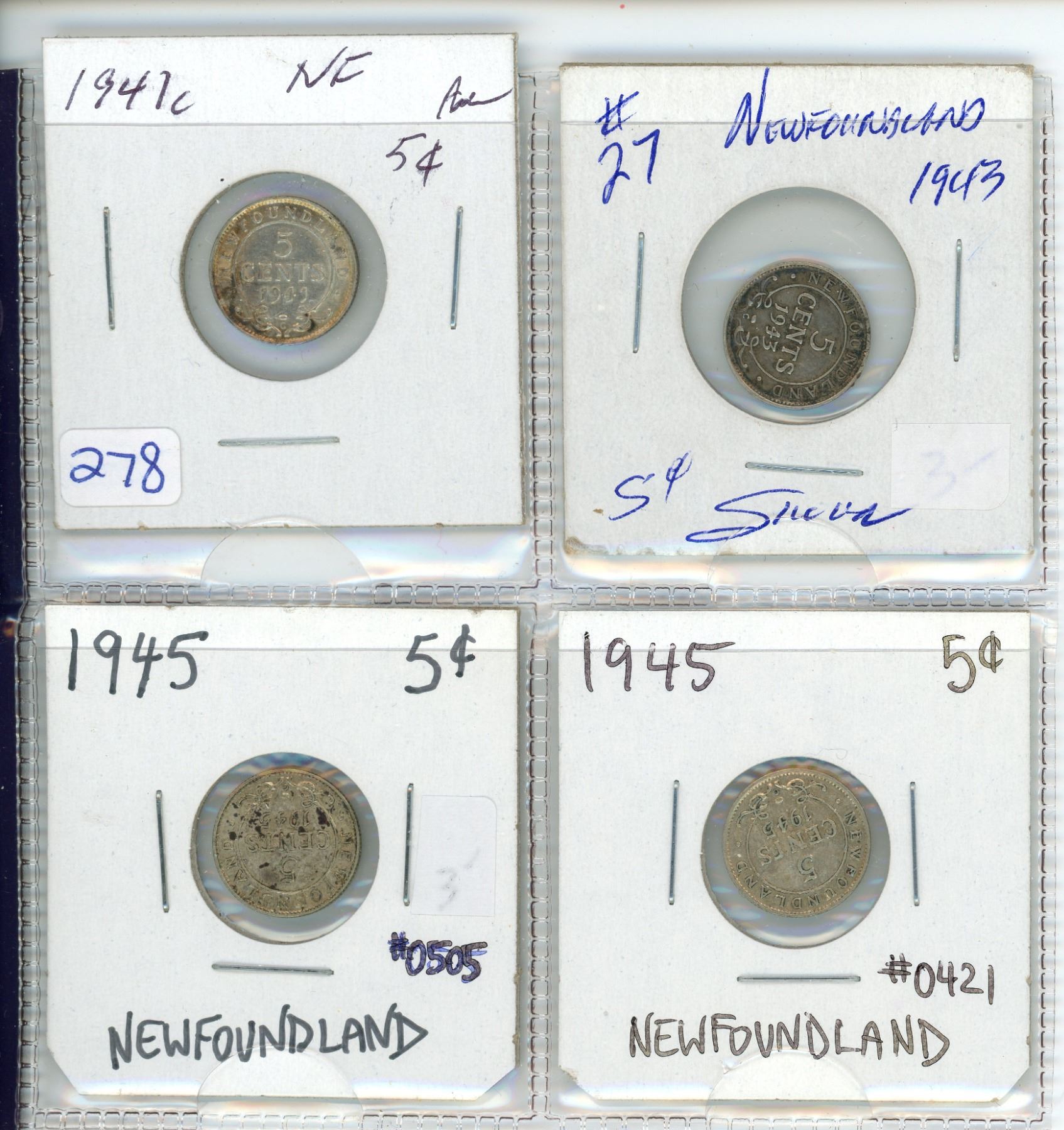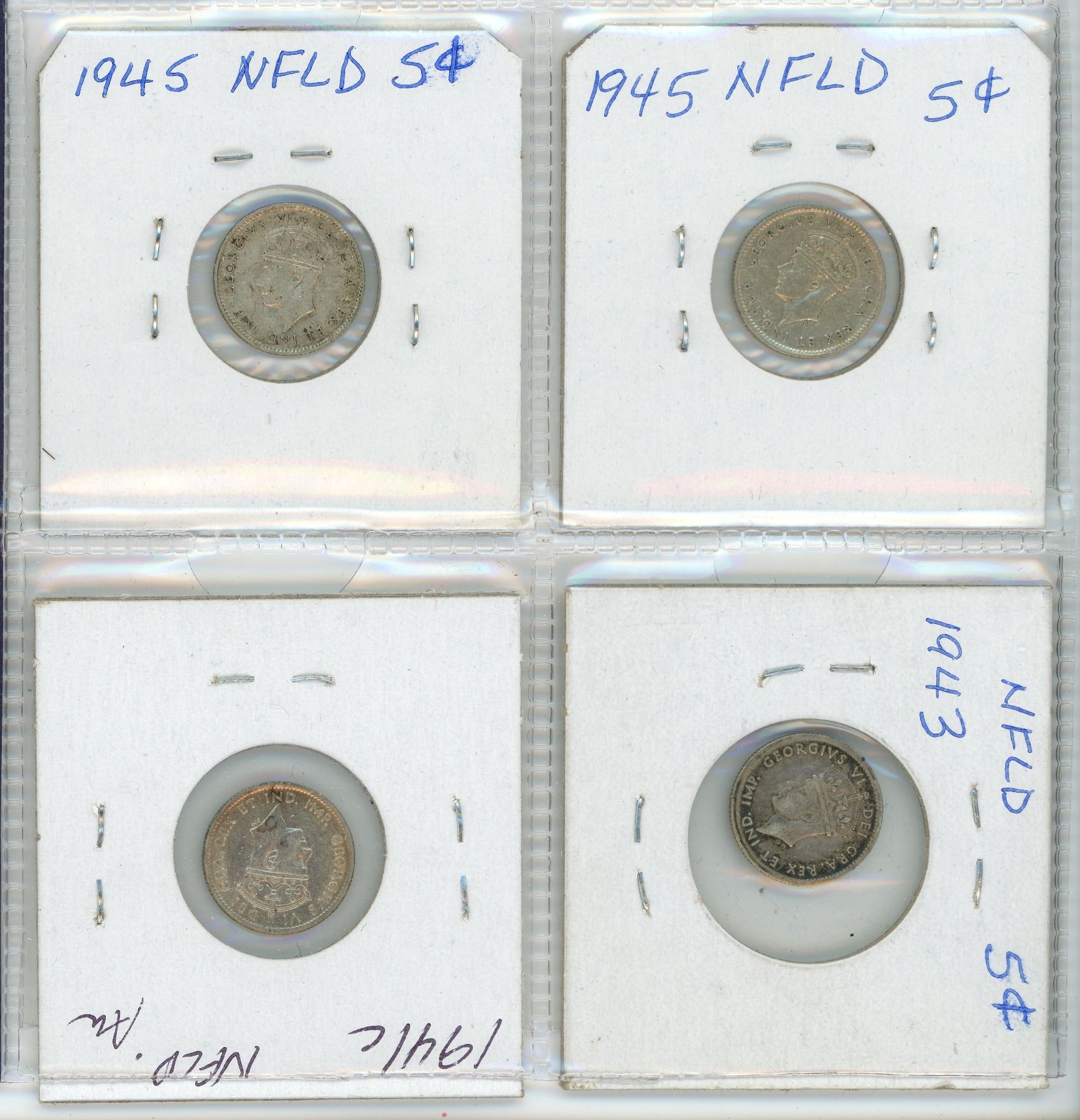 Lot of 4 Newfoundland 5¢L 1941 c, 1943, 1945 x 2