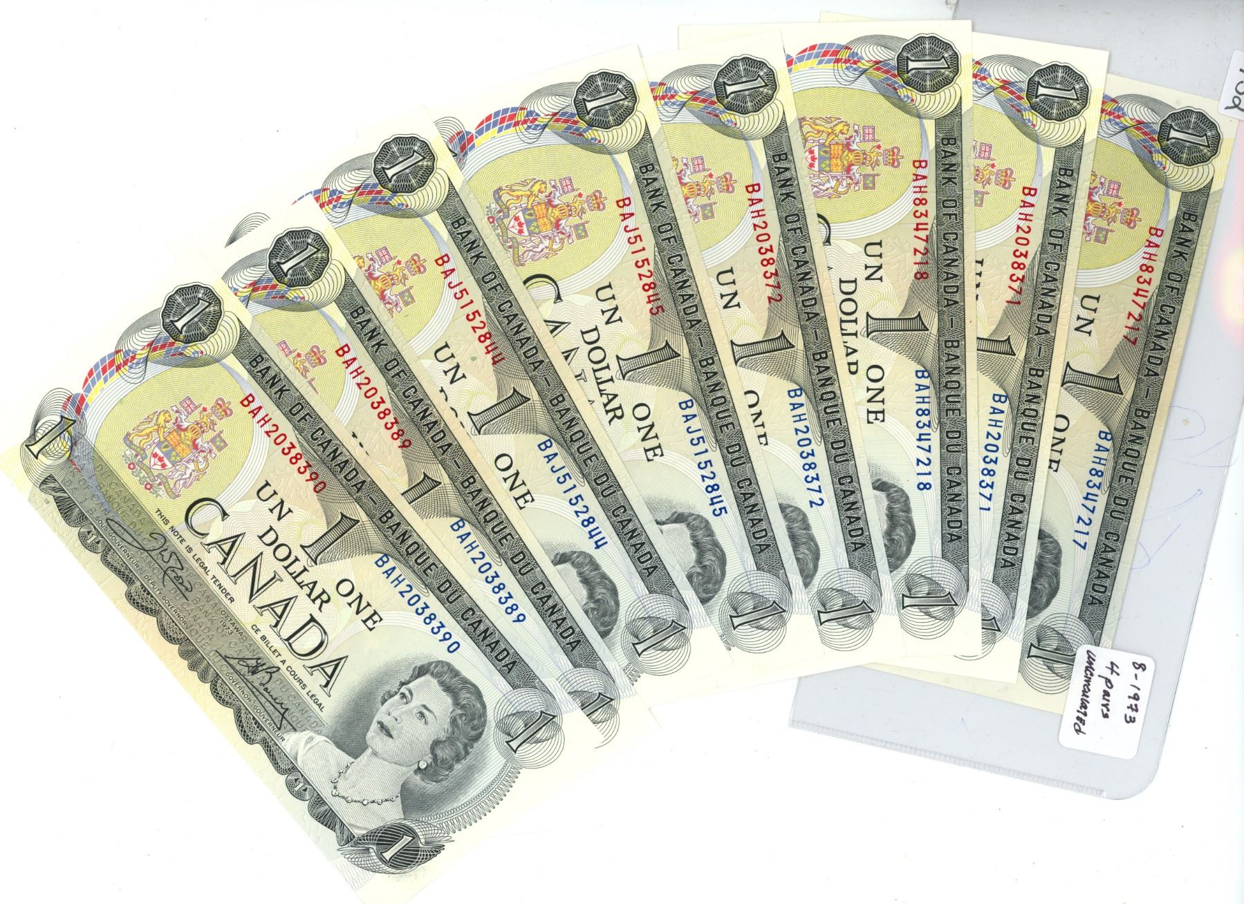 Lot of 4 Pairs UNC canada 1973 $1, all crow/bouey (#BAH 8347217-218; #BAH 2038371-372; #Baj 5152844-45; #BAH 2038389-390
