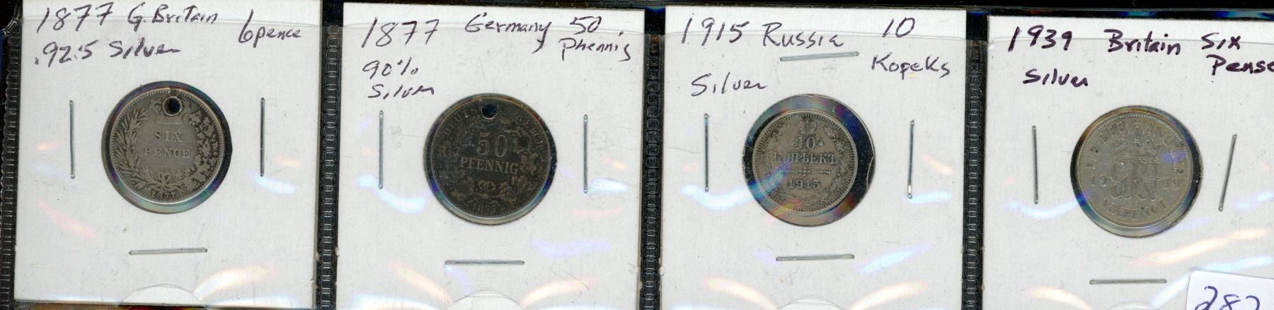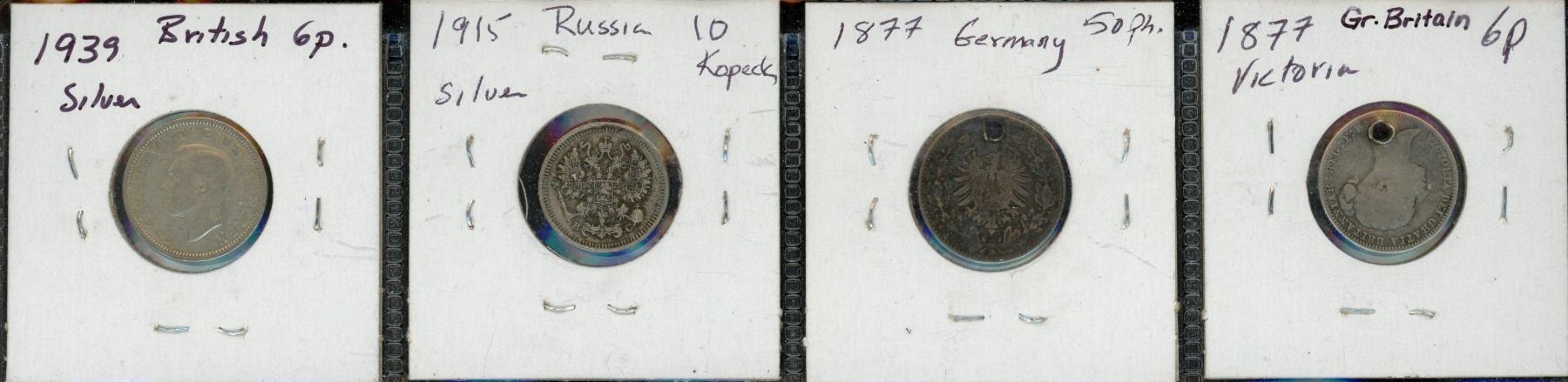 Lot of 4 Silver Coins: 1877 Gr. Br. 6 Pence, 1877 Germany 50 Pfennig, 1915 Russia 10 Kopeks, 1939 G