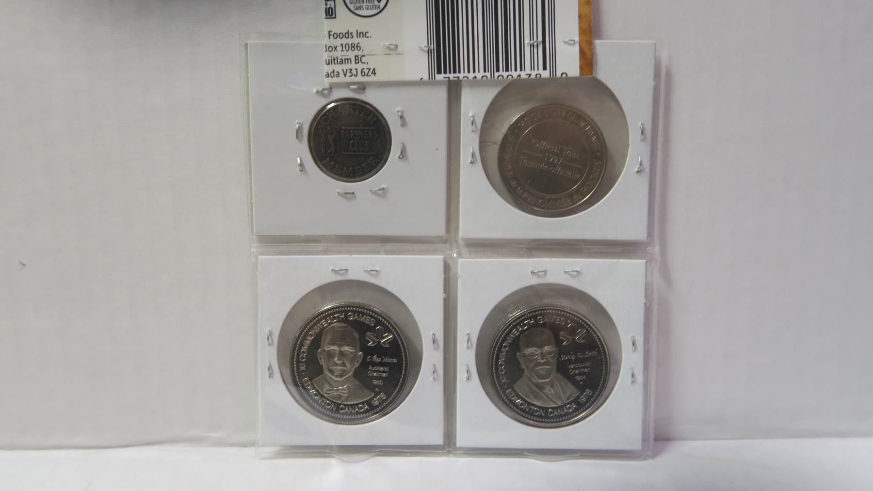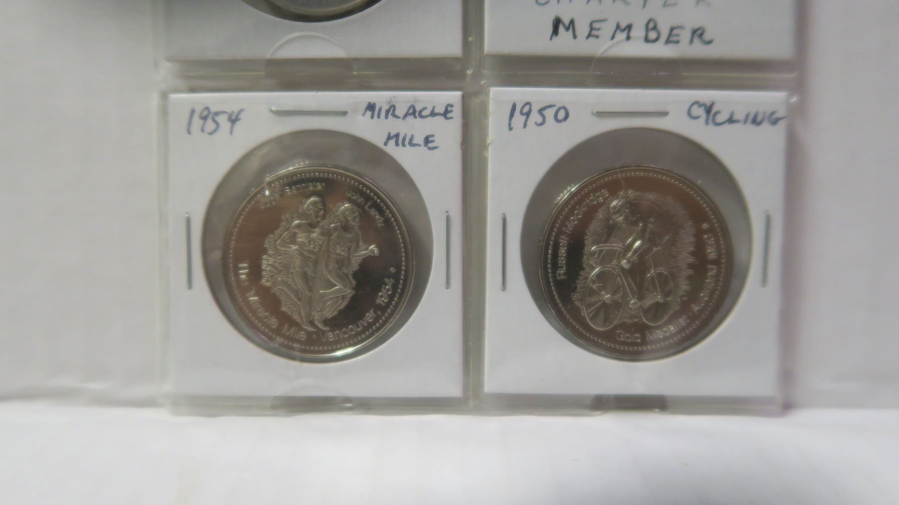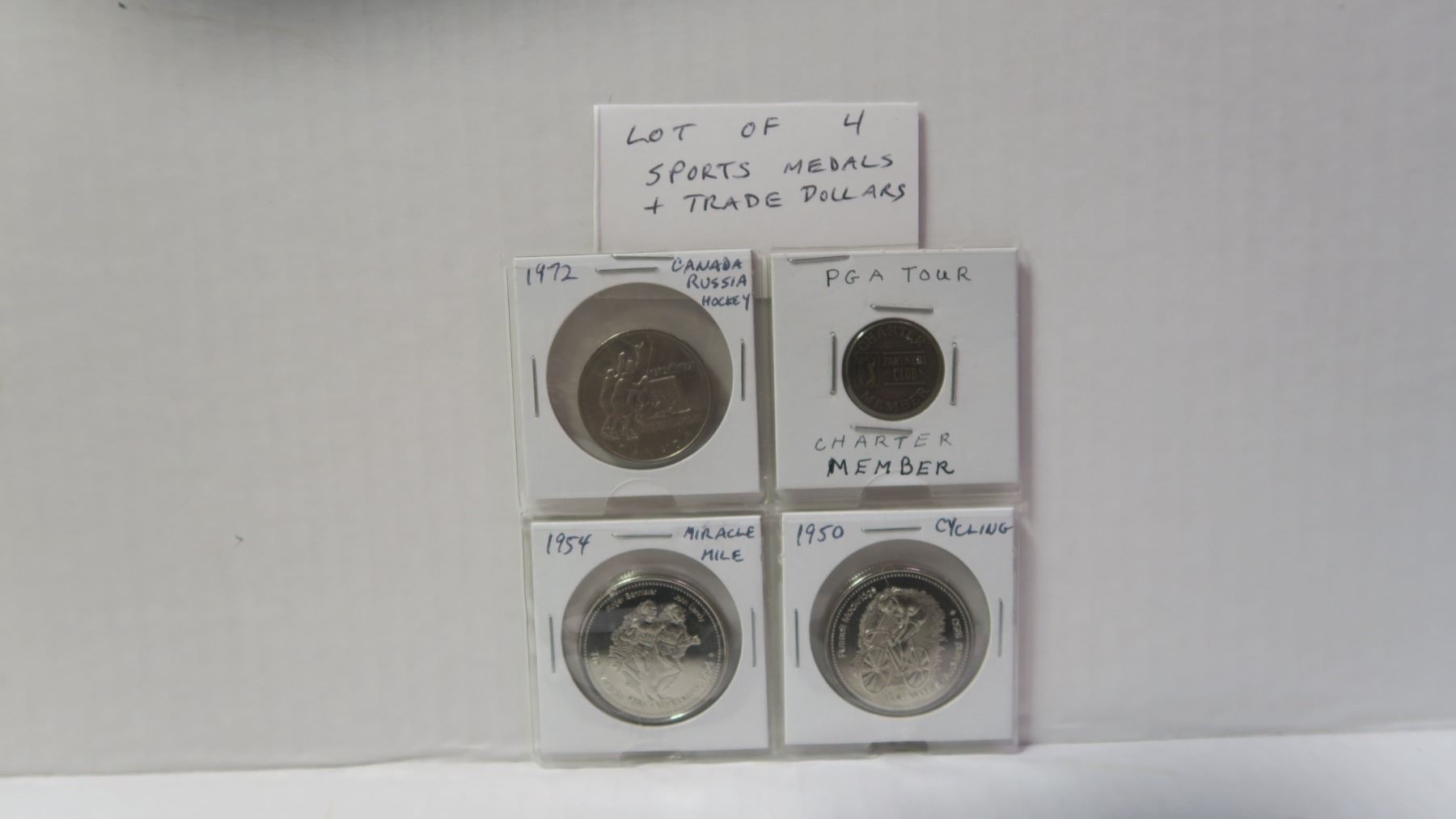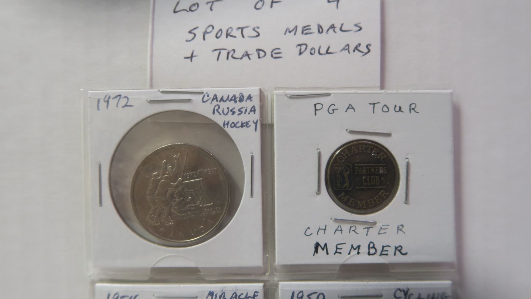 Lot of 4 Sports Medals & Trade Dollars. Includes 1972 Canada-Russia Hockey, PGA Golf, Miracle Mile & Cycling. Uncirculated.