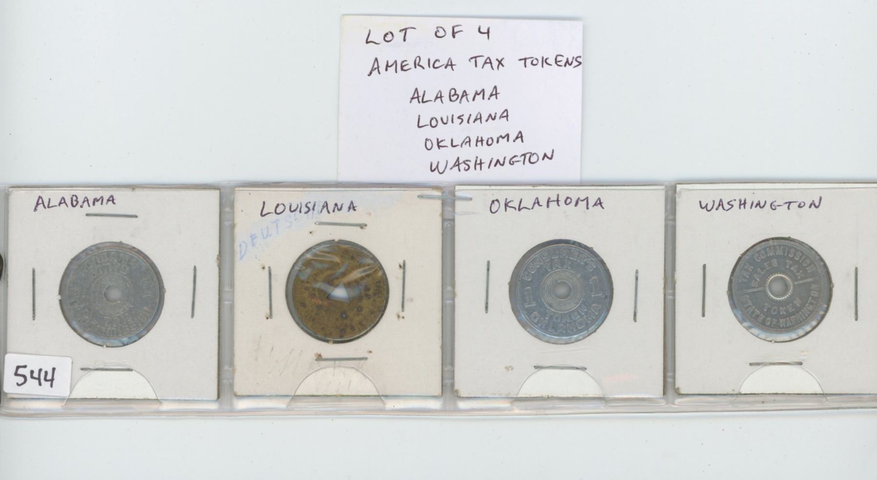 Lot of 4 U.S. Tax Tokens: Alabama, Louisiana, Oklahoma, Washington.